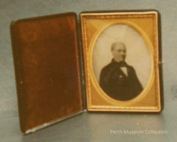 This daguerreotype is of Roderick Matheson as an older man, probably in his late 60's or early 70's. He is facing right and wearing a suit. It is in a plain black leather case and opens to show Roderick framed in an oval gilded metal mat. The inside of the facing cover is padded with faded plum coloured velvet. The face has been faintly coloured with pink and is recognizable, but the torso part has decomposed as daguerreotypes have a habit of doing when exposed to too much light.