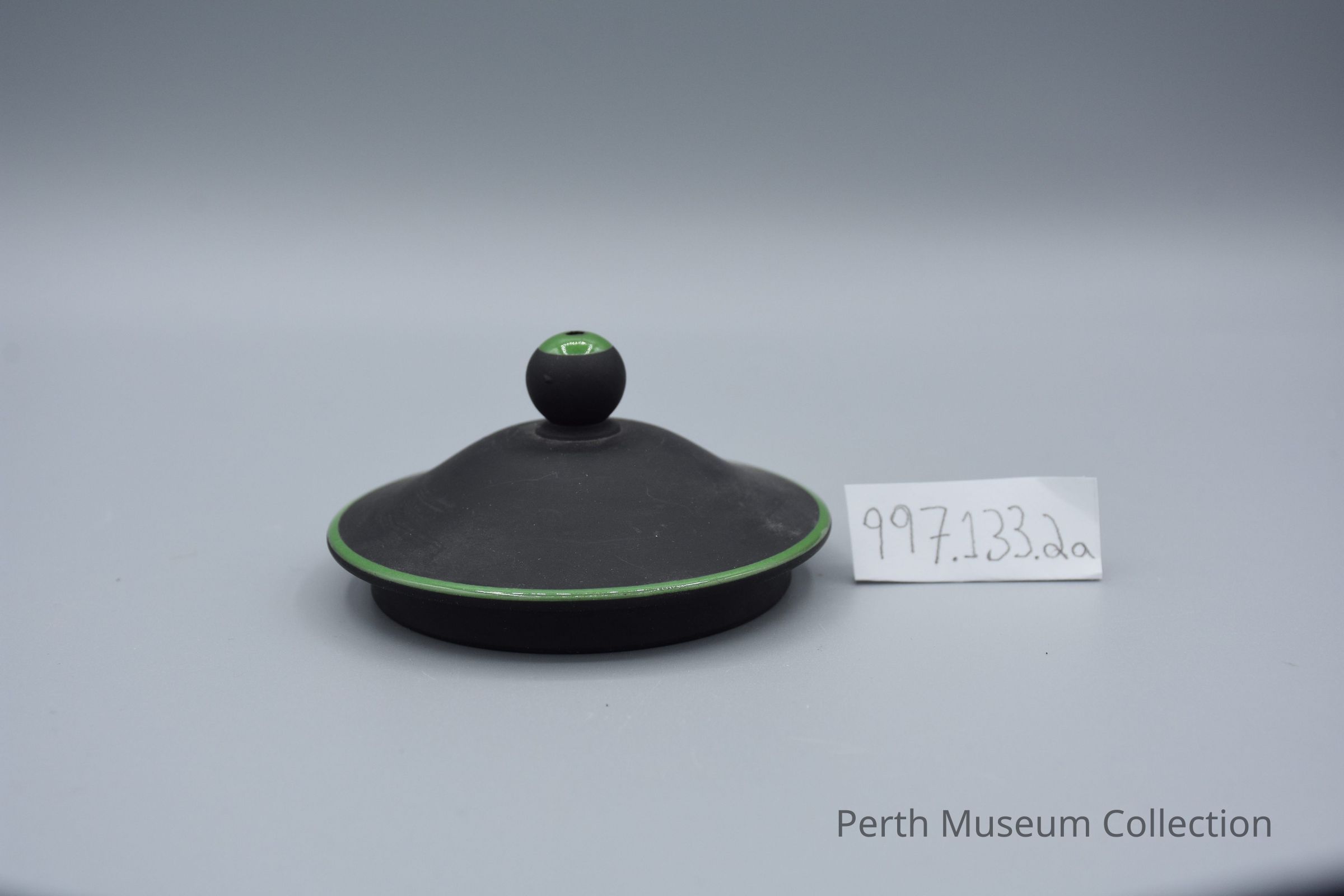 Souvenir lid of sugar bowl is made of black basalt stoneware and was made in England in 1879. The crest is the Town of Perth's Log. On the banner is latin is "Festina Lente Sed Certo" (Make Haste Slowly) and underneath "Perth, Ontario".Made/Created
