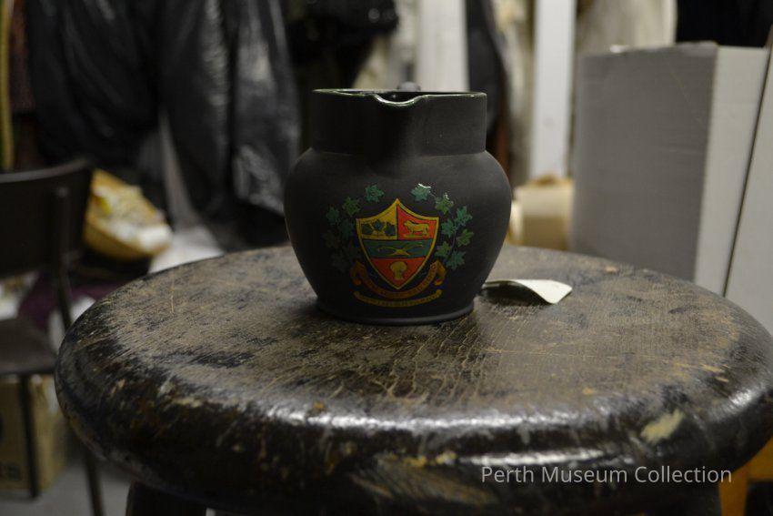 Souvenir cream pitcher is made of black basalt stoneware and was made in England in 1879. The crest is the Town of Perth's Log. On the banner is Latin is "Festina Lente Sed Certo" (Make Haste Slowly) and underneath "Perth, Ontario".Made/Created