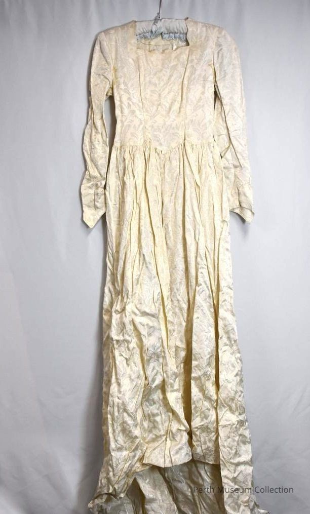 007.19.7a - Satin brocade wedding dress, 1948. Ivory. Long sleeves are fitted with wrist ending in a point with a snap closure. Dress has a scalloped neckline and a side zipper. Waistline scalloped as well. Skirt very full.