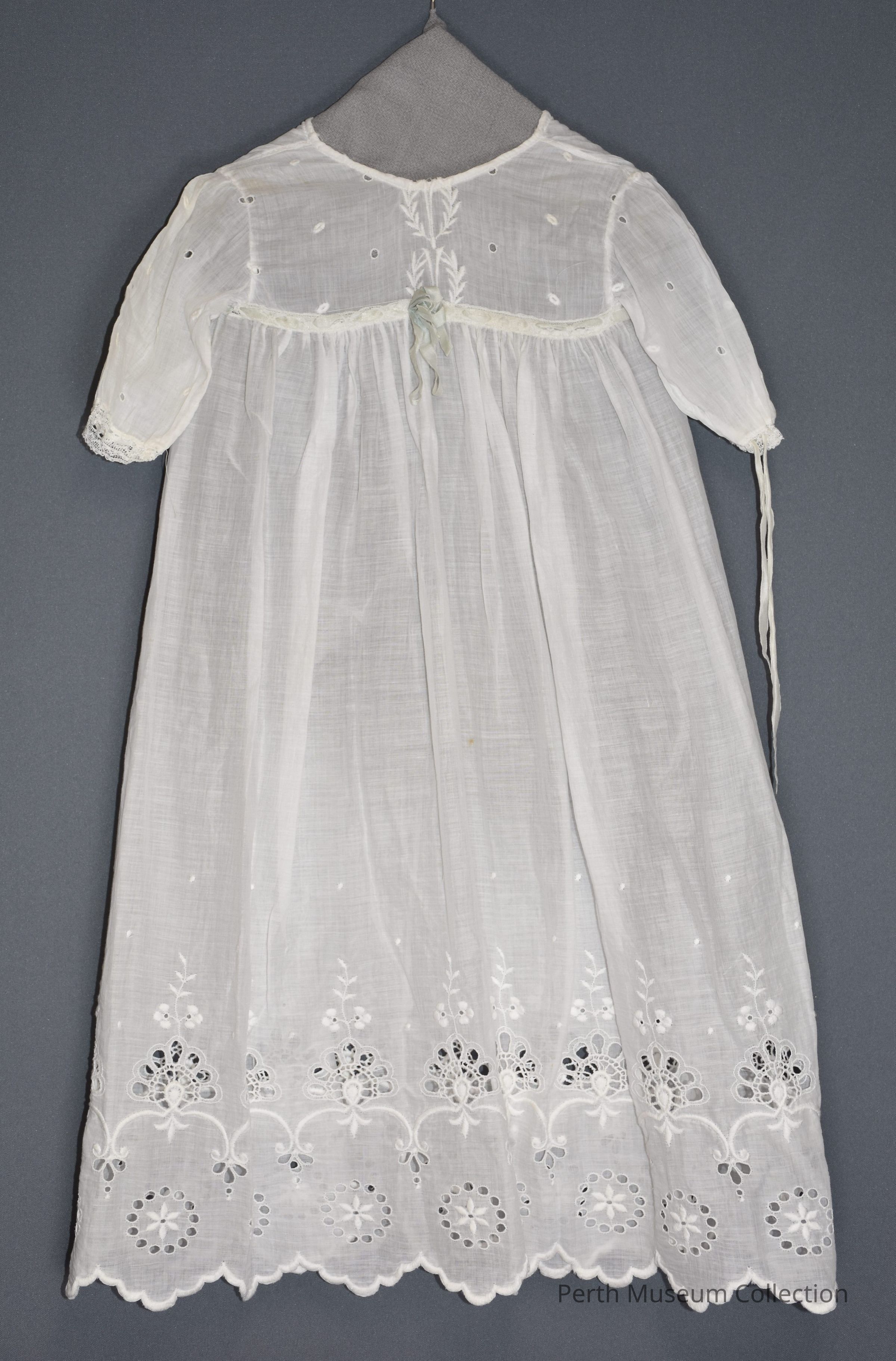 White cotton nightgown with lace trim and a pale green ribbon around bodice.