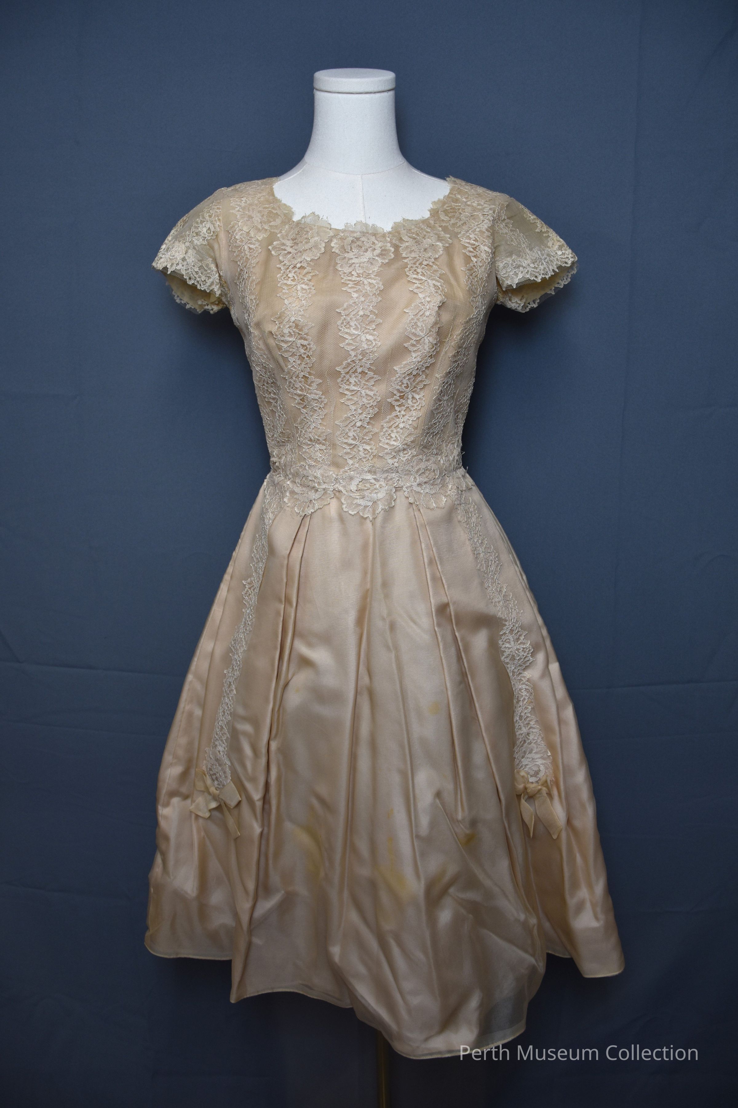 Cream colour taffeta wedding dress with a heavy net crinoline. Short sleeves, scooped neck lace bodice. 2 lace panels down front of gathered skirt ending with bows. Skirt has 2 layers of crepe & taffeta over the crinoline. 4 panels of lace at back of skirt.