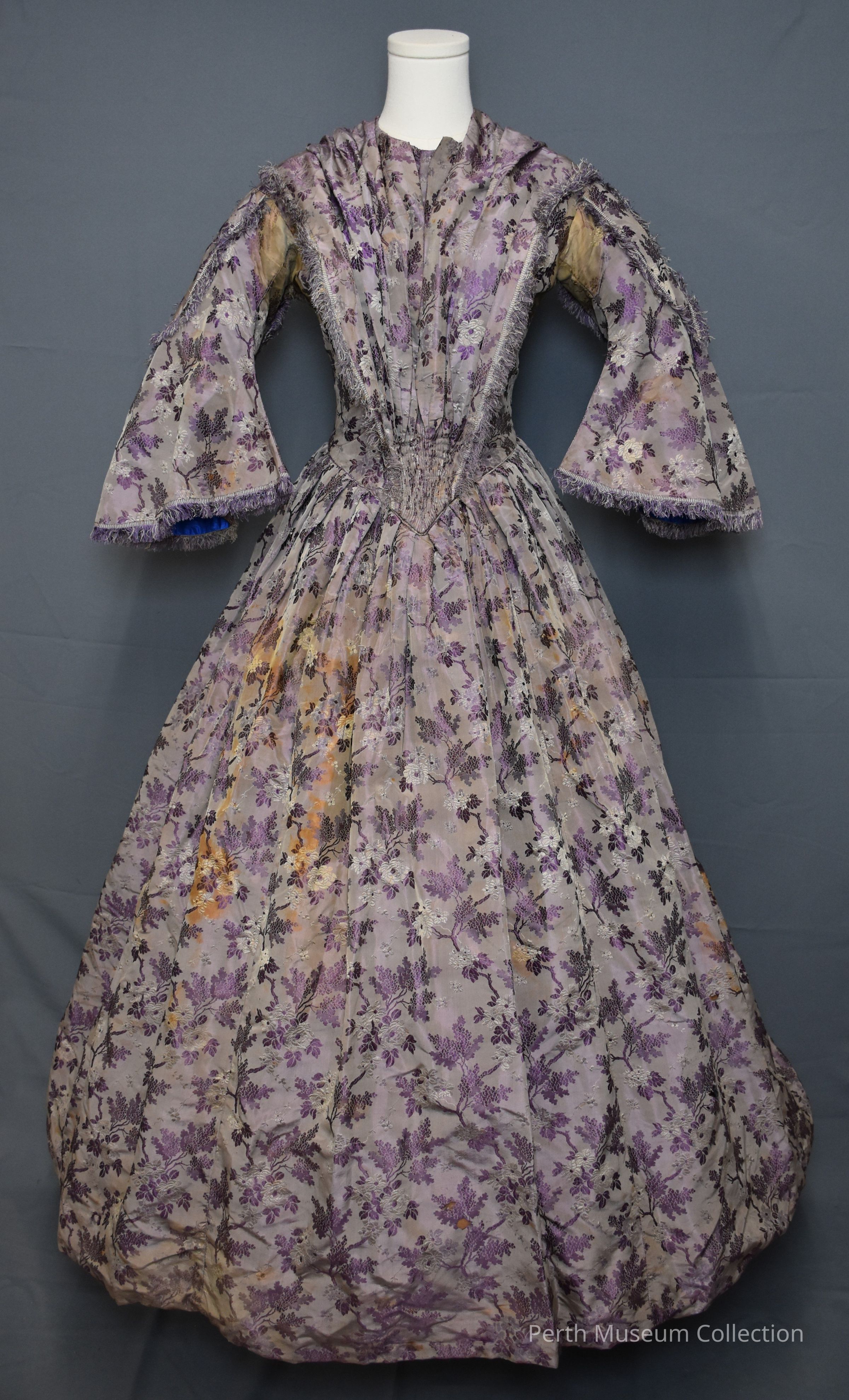 - The material used was silk of a lavender colour which is embroidered with a purple and white floral pattern. The lining of the dress is cotton and is stained a golden colour . Inside the sleeves there is a light blue satin lining that measures 8 inches on the outside seam and 3 inches in the inside seam.