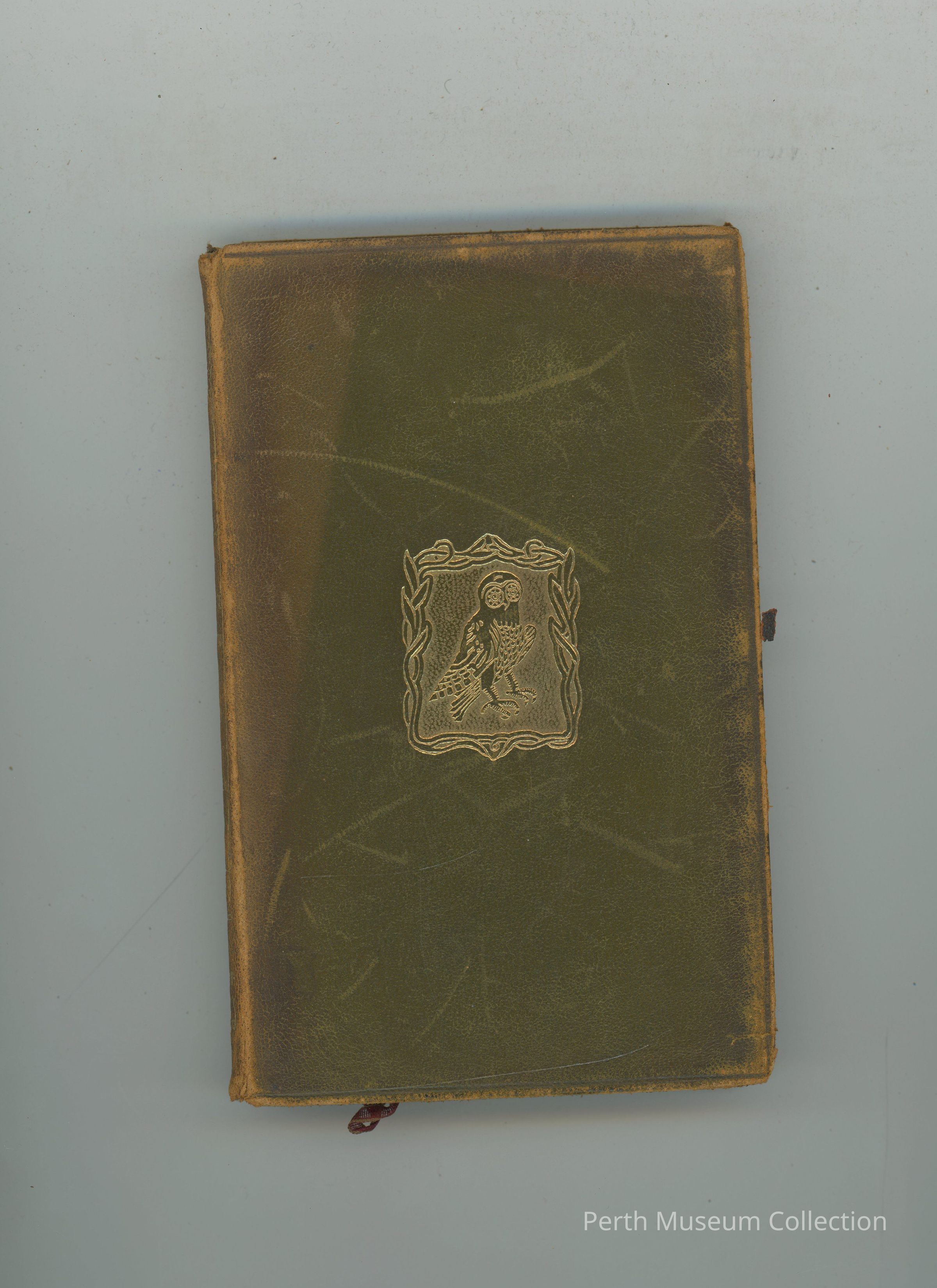 988.56.15 - Softcover - 294 Pages - The cover is bound in green leather, there is discoloration on the front at the top light corner ruing down the left side. There is a gold owl printed in the middle of the front and the spine has the title, translator, volume, and publisher printed in gold.Dimensions