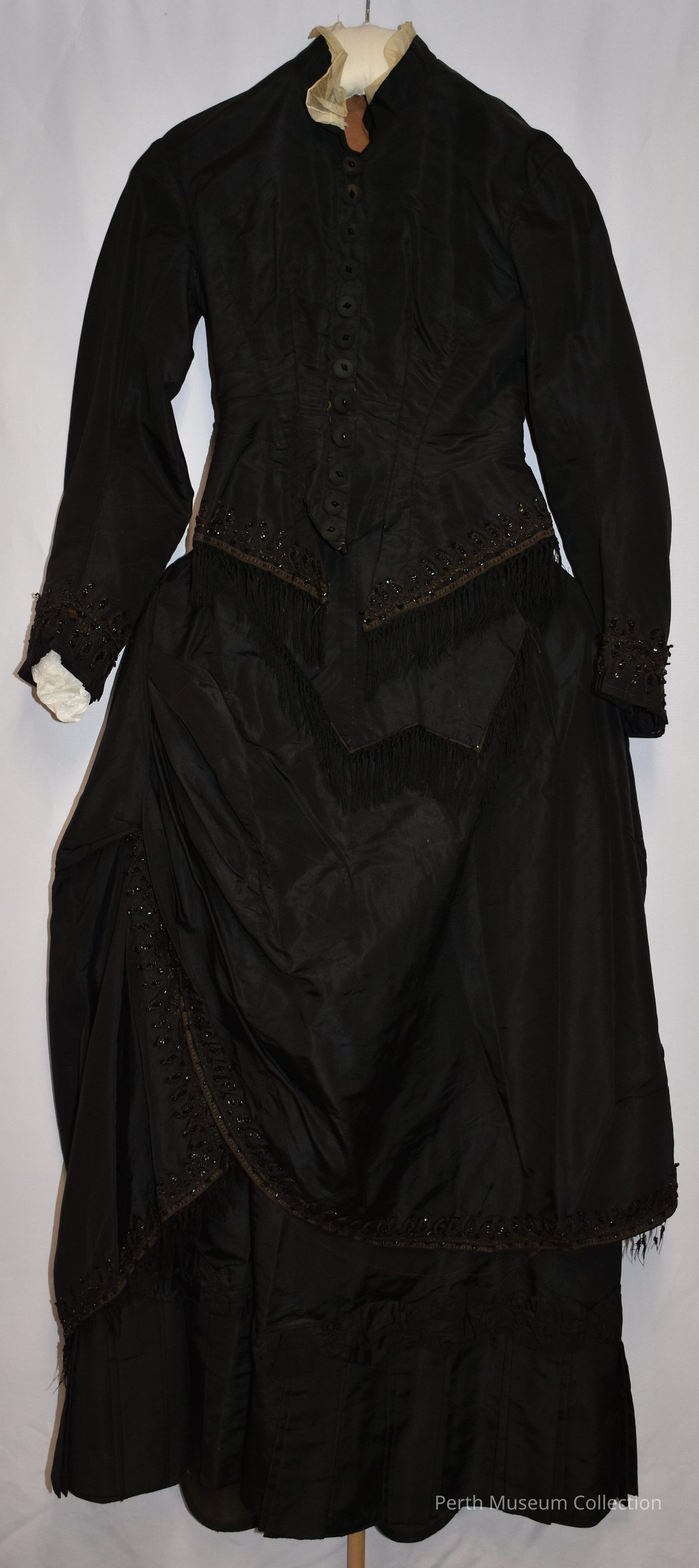 997.62.2a - Black silk dress bodice with black jet bead and braid trim on pleated cuffs. The fitted waist came to a centre point in front with 2 long points on either side and an arrangement in pleats in the back coming down to 2 long points, all of which are trimmed with black jet beads, braid, and fringe. The high neck has a small white (yellowed) ruffle. There are 12 round buttons in front each with a black diamond shaped bead in the centre.