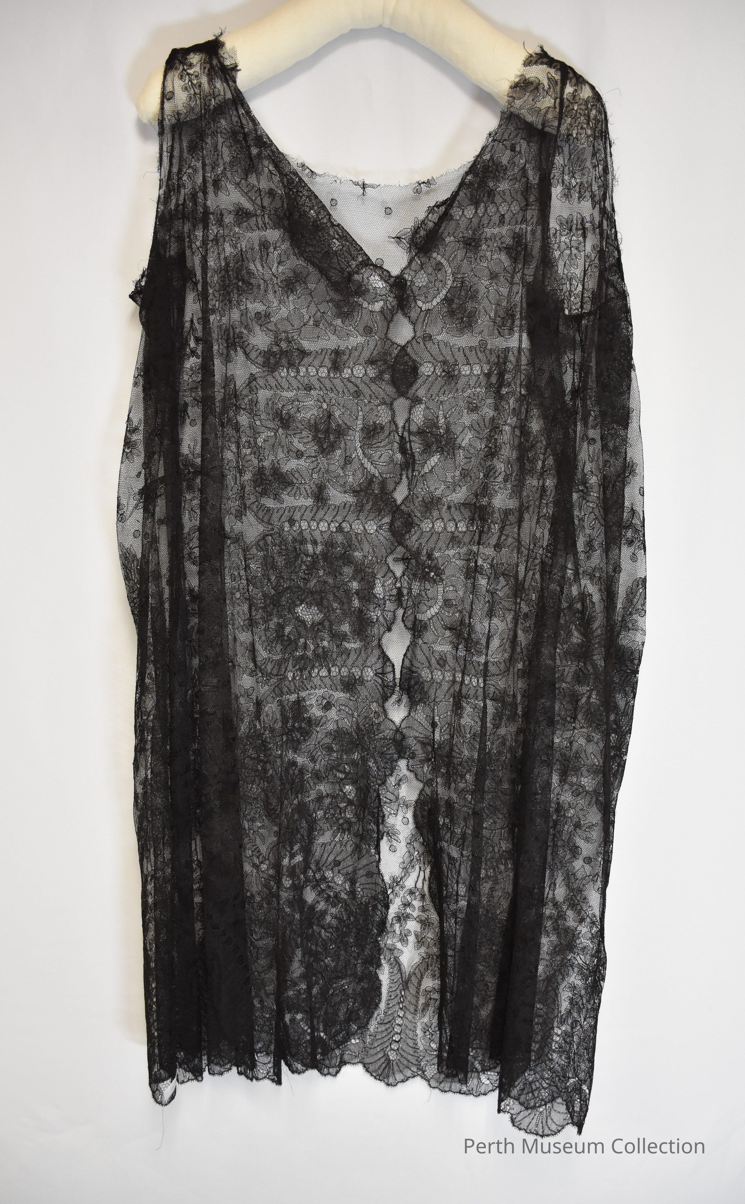 Slip or unfinished dress of black net lace, has no sleeves. The scalloped front edges close with snaps. The bottom is also scalloped.