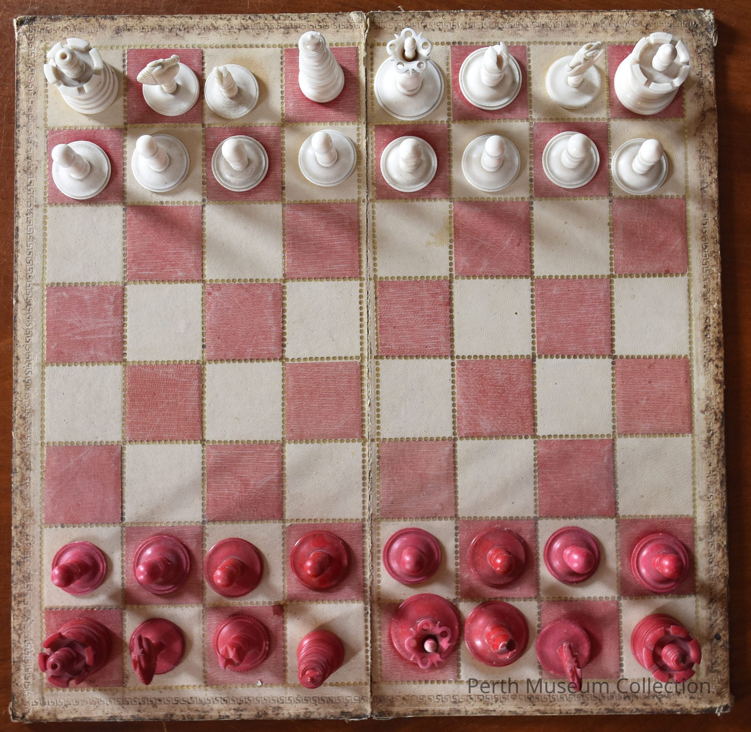 997.70.14.2 - Chess board, 35.4 cm square. The board is covered both sides with a fine leather, marbled tan on the bottom, and light tan and stained red on the playing surface. The tan and red squares are 3.8 cm square and are separated by rows of tightly-spaced embossed gold dots about 2 mm in diameter. There is a margin of 1.5 cm between the outer square and the edge of the board and running along this margin is a continuous embossed key pattern.