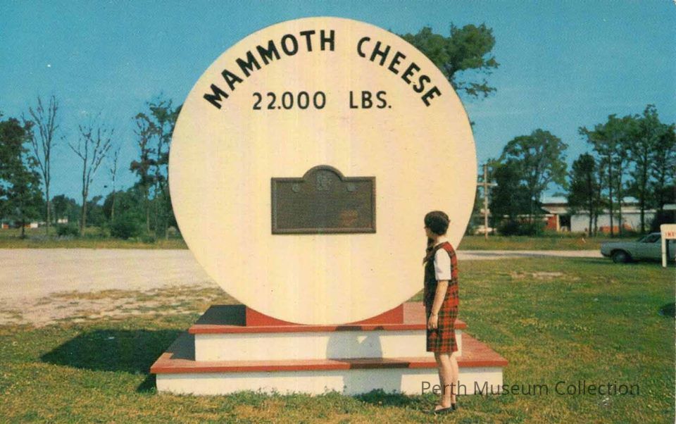 Colour postcard from the late 1960's. This was out on HWY#7 when there was a tourist information booth located there, where A&B Motors is now. Anyone remember the information booth in the shape of the big cheese? This is model of the cheese with a plaque attached. Beside the model to the left was the tourist information centre.