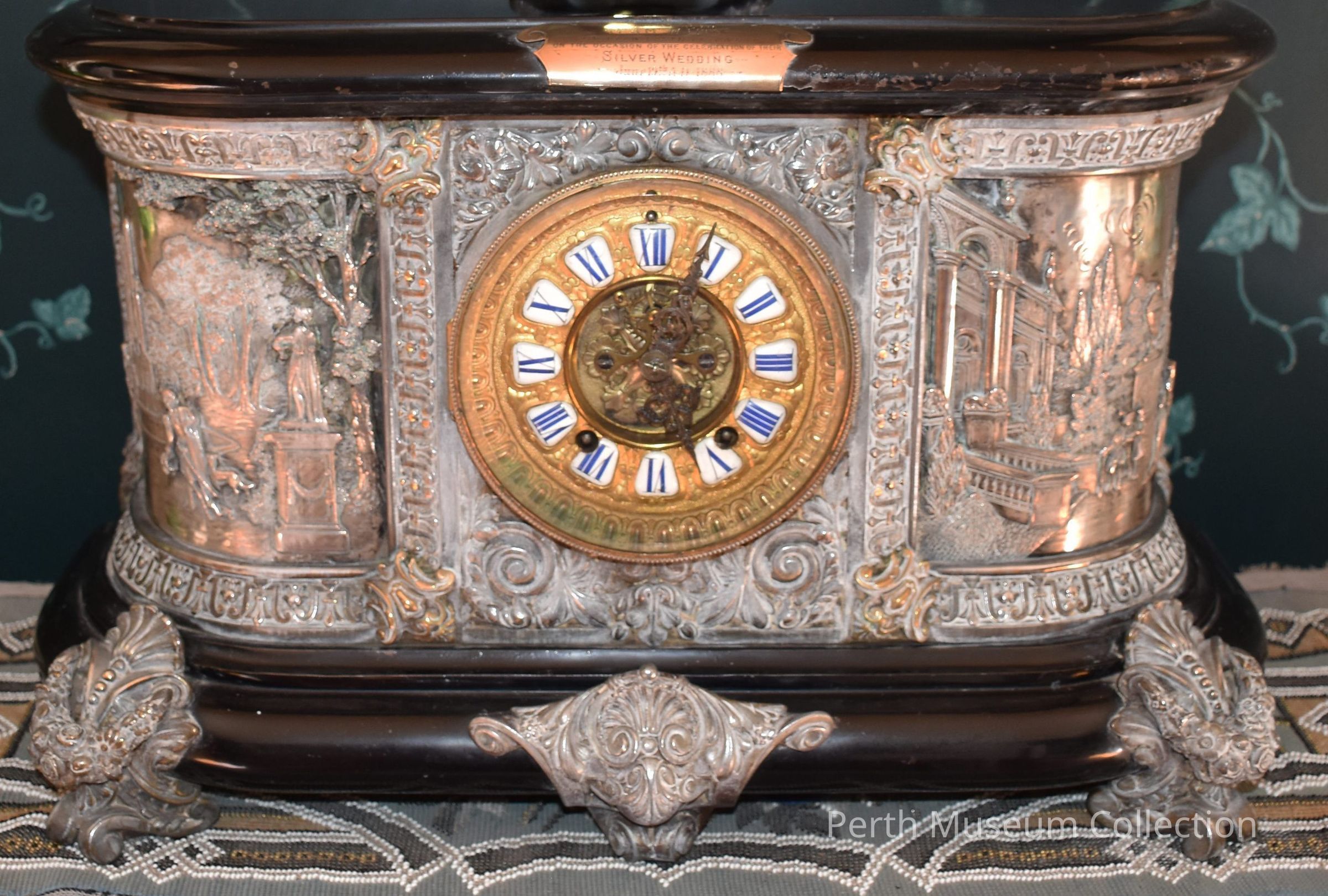 Highly ornamental mantel or shelf clock, constructed of iron, wood, brass, silver, and possibly white metal. The top of the clock is flat and plain, black enamel or paint over hardwood. To the front of the clock, on a bevelled edge of the top, is attached a brass plate, 10.1 cm long x 3.6 cm wide, engraved with: