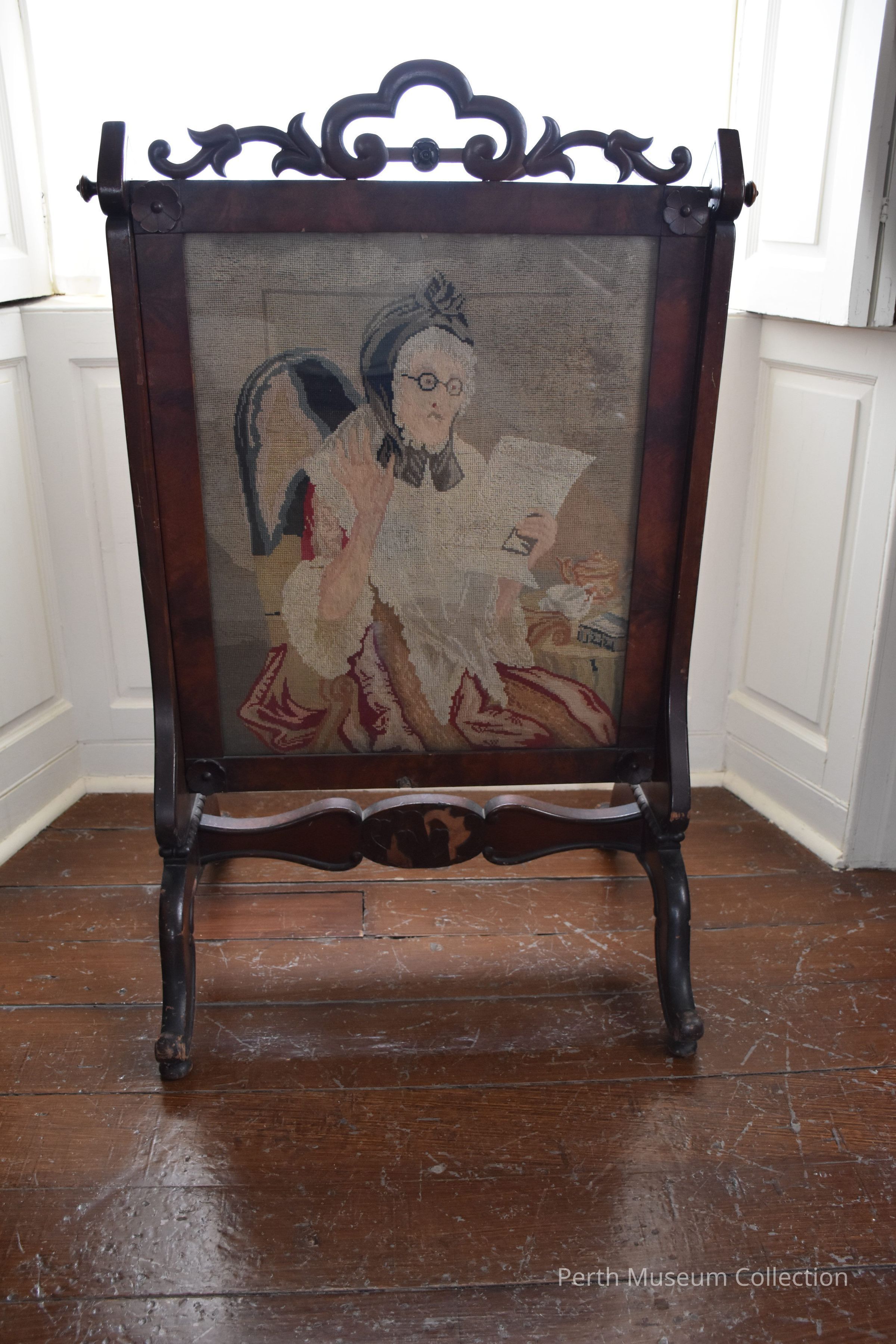 The image showcases an antique firescreen with an intricately carved wooden frame featuring decorative scrollwork at the top, placed on a wooden floor within a room with white paneled walls. The screen itself displays a tapestry depicting an elderly woman with spectacles, wearing a bonnet and a shawl, who is intently reading a piece of paper while raising her hand, offering a glimpse into a bygone era. The craftsmanship of both the frame and the detailed tapestry offers a rich historical and artistic charm.