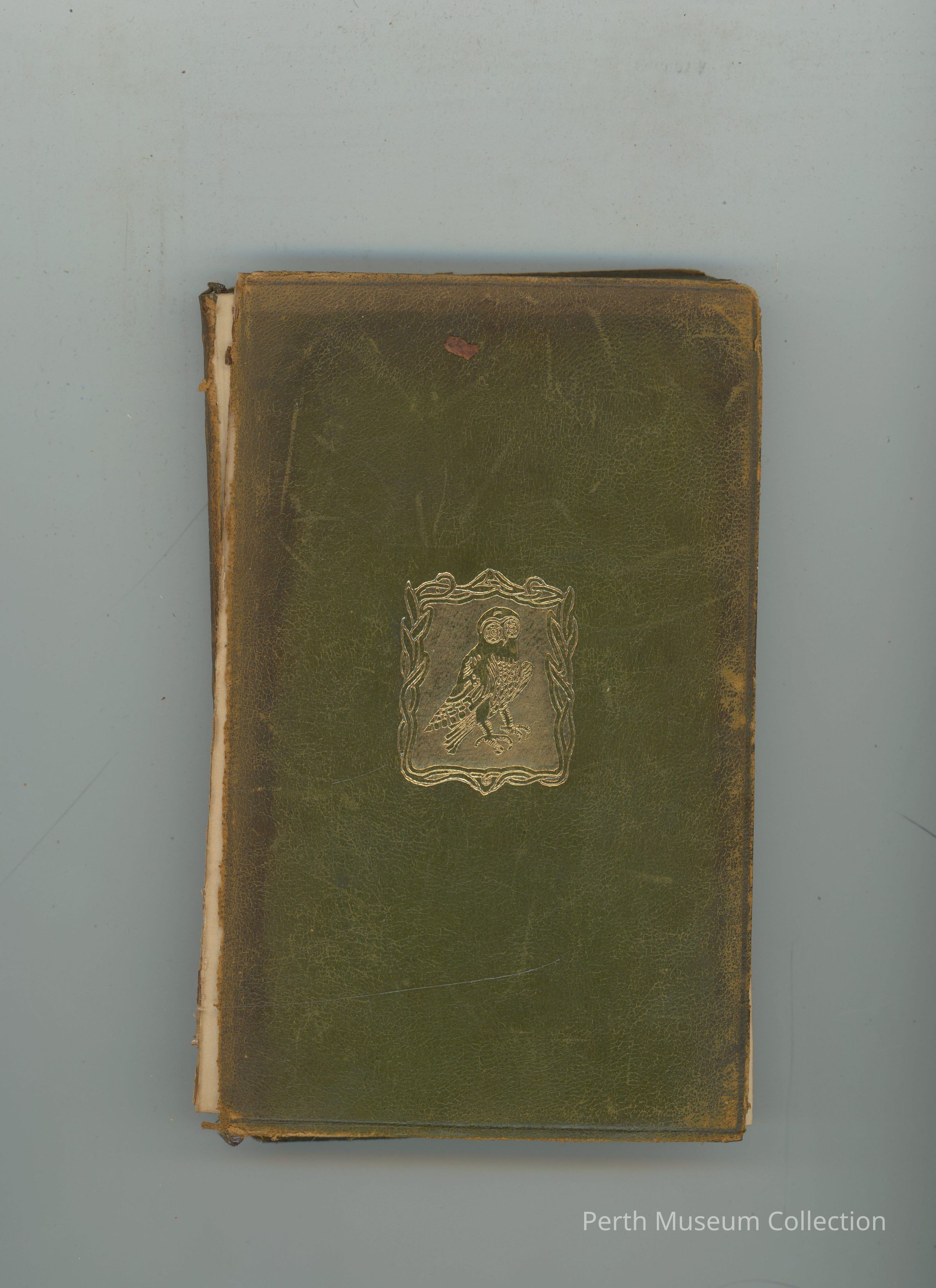 988.56.16 - Softcover - 427 Pages - The cover is bound in green leather, there is discoloration on the front around the edges. There is a gold owl printed in the middle of the front and the spine has the title, translator, volume, and publisher printed in gold.