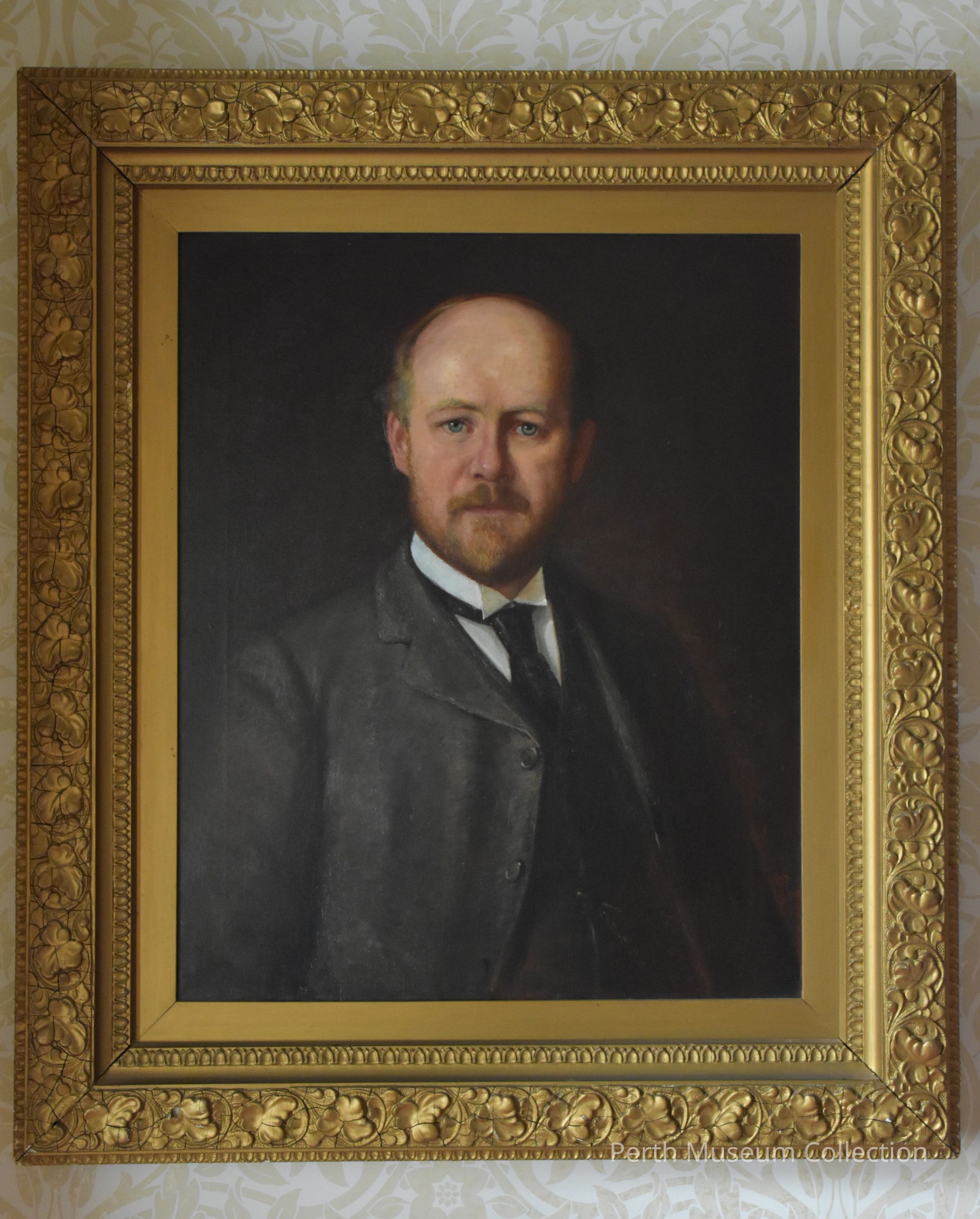 The image depicts a formal portrait painting of a man with a beard, dressed in a dark suit, white shirt, and a tie, presented against a dark background, all encompassed by an ornate gold frame featuring intricate floral patterns, with the painting hanging on a wall covered in subtly patterned wallpaper, creating an atmosphere reminiscent of a classic or historical setting, evoking a sense of timelessness and dignity, and highlighting the craftsmanship both in the painted portrait and the elaborately carved frame, which complements the overall painting.