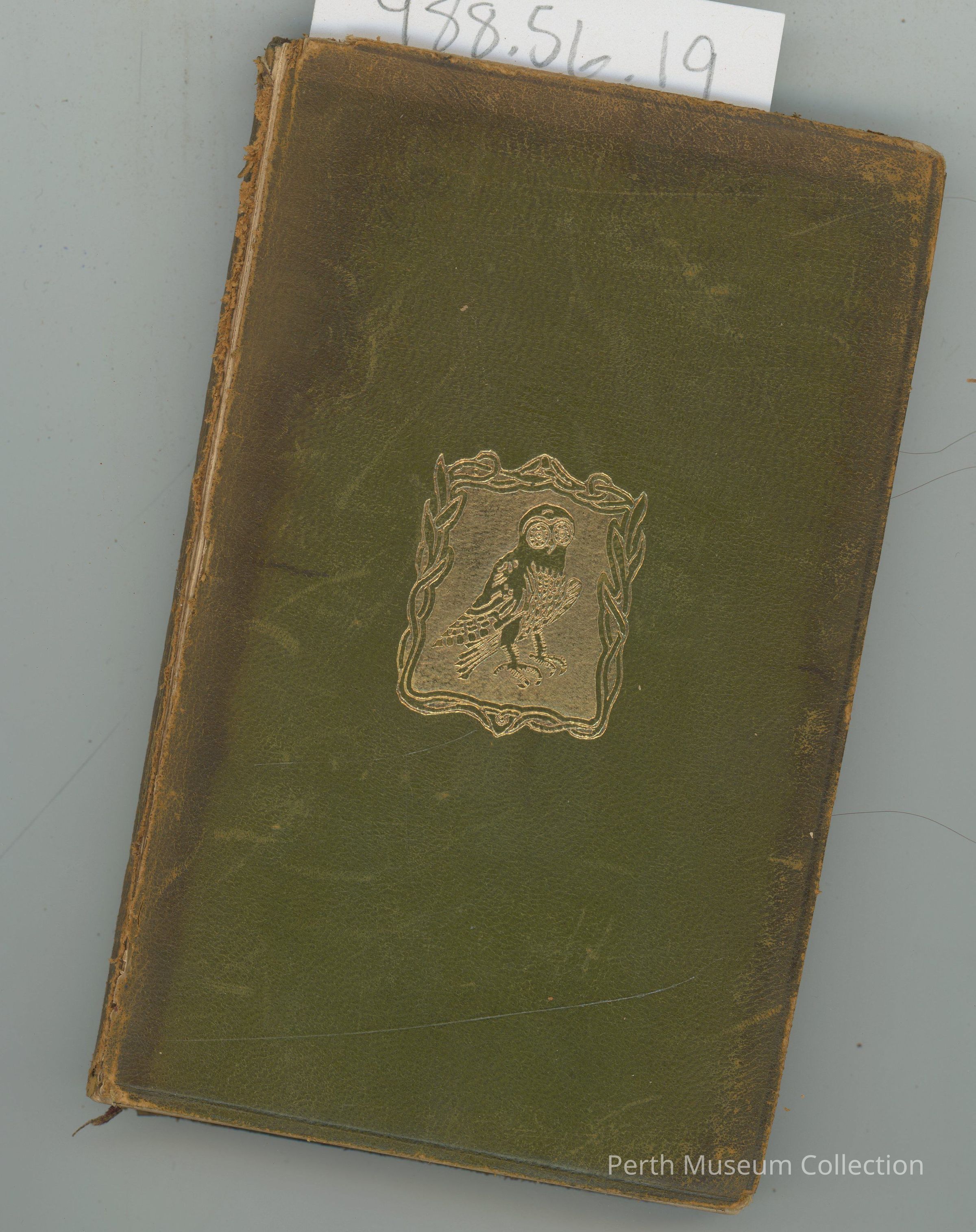 988.56.19 - Softcover - 288 Pages - The cover is bound in green leather, there is discoloration on the front around the edges. There is a gold owl printed in the middle of the front and the spine has the title, translator, volume, and publisher printed in gold.