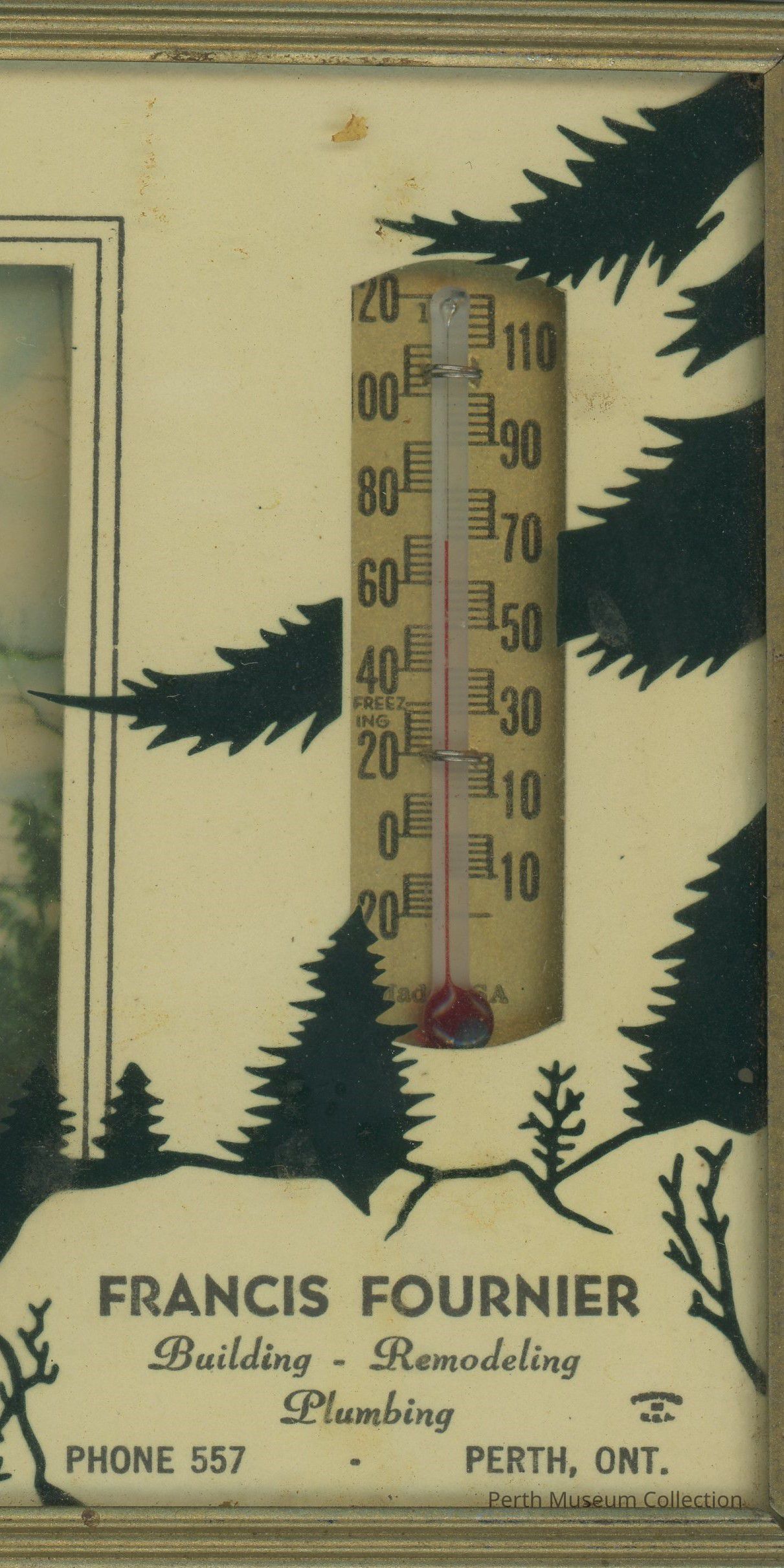 On the far right is a thermometer, with a vile of red mercury, gold plate with numbers in black. First column from top to bottom 120 degrees to minus 20 degrees. In between 40 and 20 degrees it say freezing; The thermometer is in the middle; second column from top to bottom 110 degrees to minus 10 degrees. At the bottom, Made in USA.Made/Created