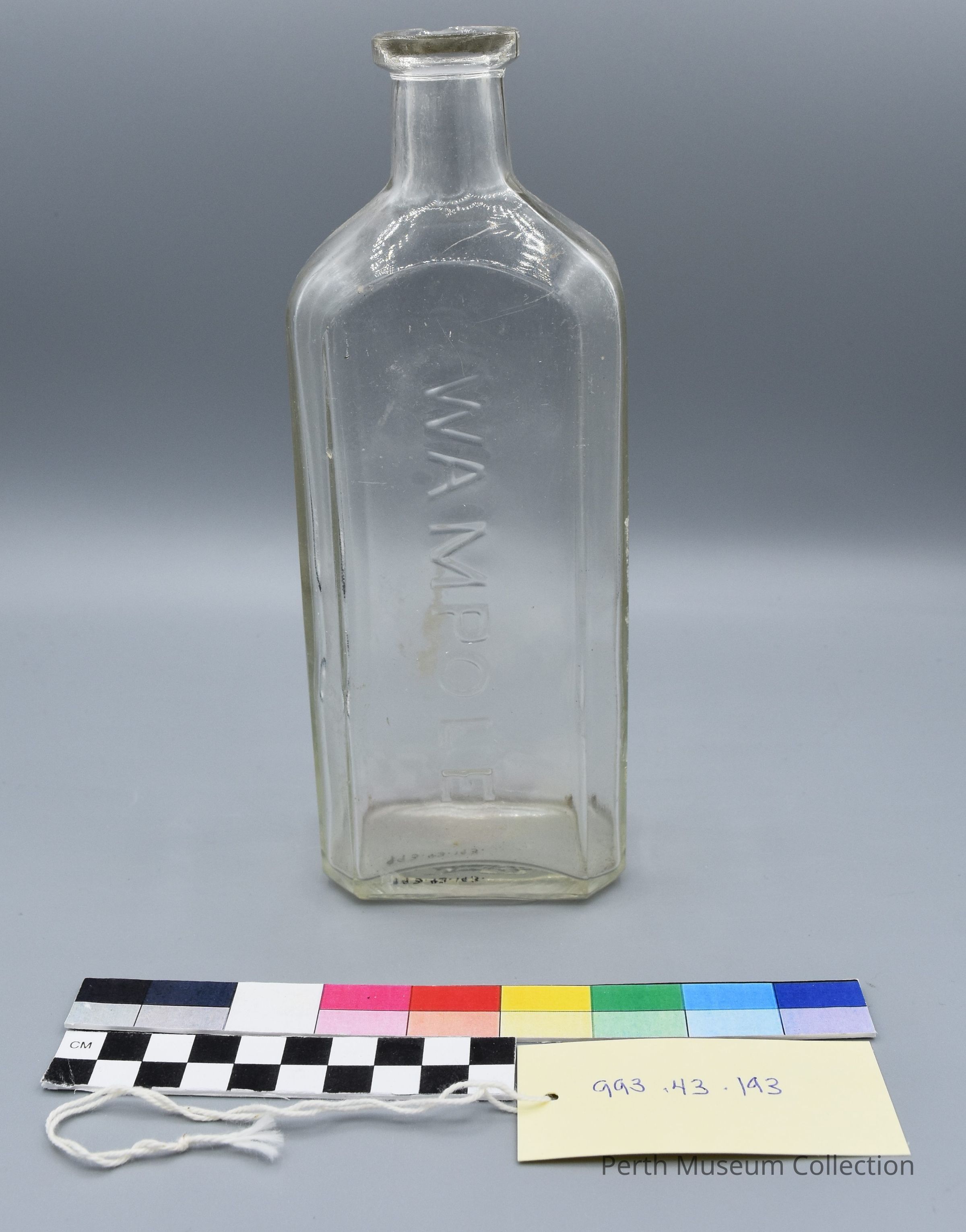 Clear glass rectangular drug or liniment bottle. It has a one-part finish and a flanged lip. Bore diameter is 3cm. The bottle is rectangular with flat chamfered corners. One side of the bottle is a recessed panel, 14.5 x 4.5cm, in which, in large, raised letters is the glass which run sideways, from top to bottom is: WAMPLOE. The bottom of the bottle is recessed and in the centre is number “1”, and two inverted triangles, the left of which has the number “5” in raised lettering.Dimensions