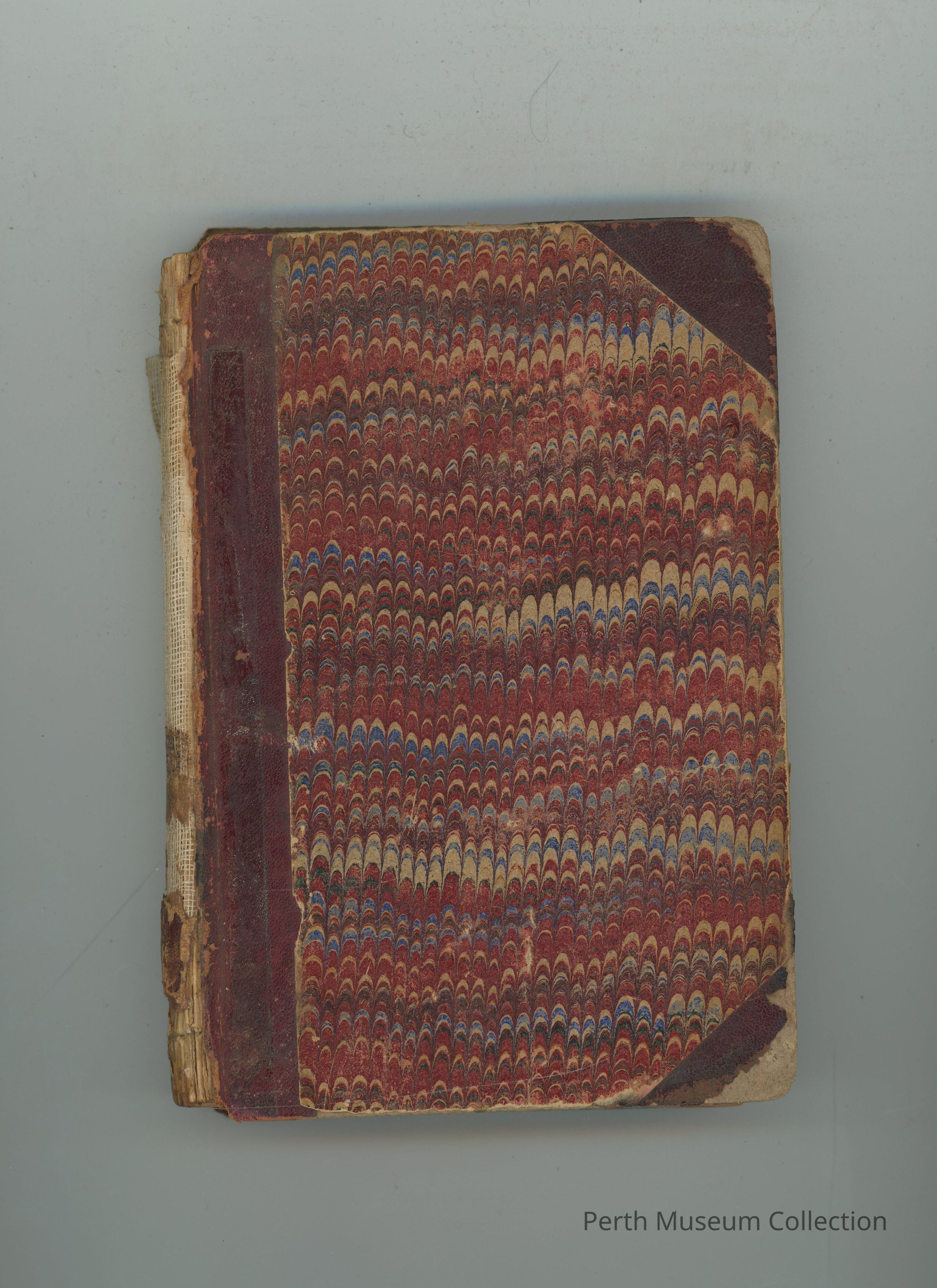 988.56.26 - Hardcover - 88 Pages - The cover of the book has a pattern of red, burgundy, beige, and blue.