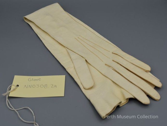 Set of womans gloves. Entire-arms length. White leather with 3 pearly buttons and slit on each wrist. Matches other glove NN0308.1a