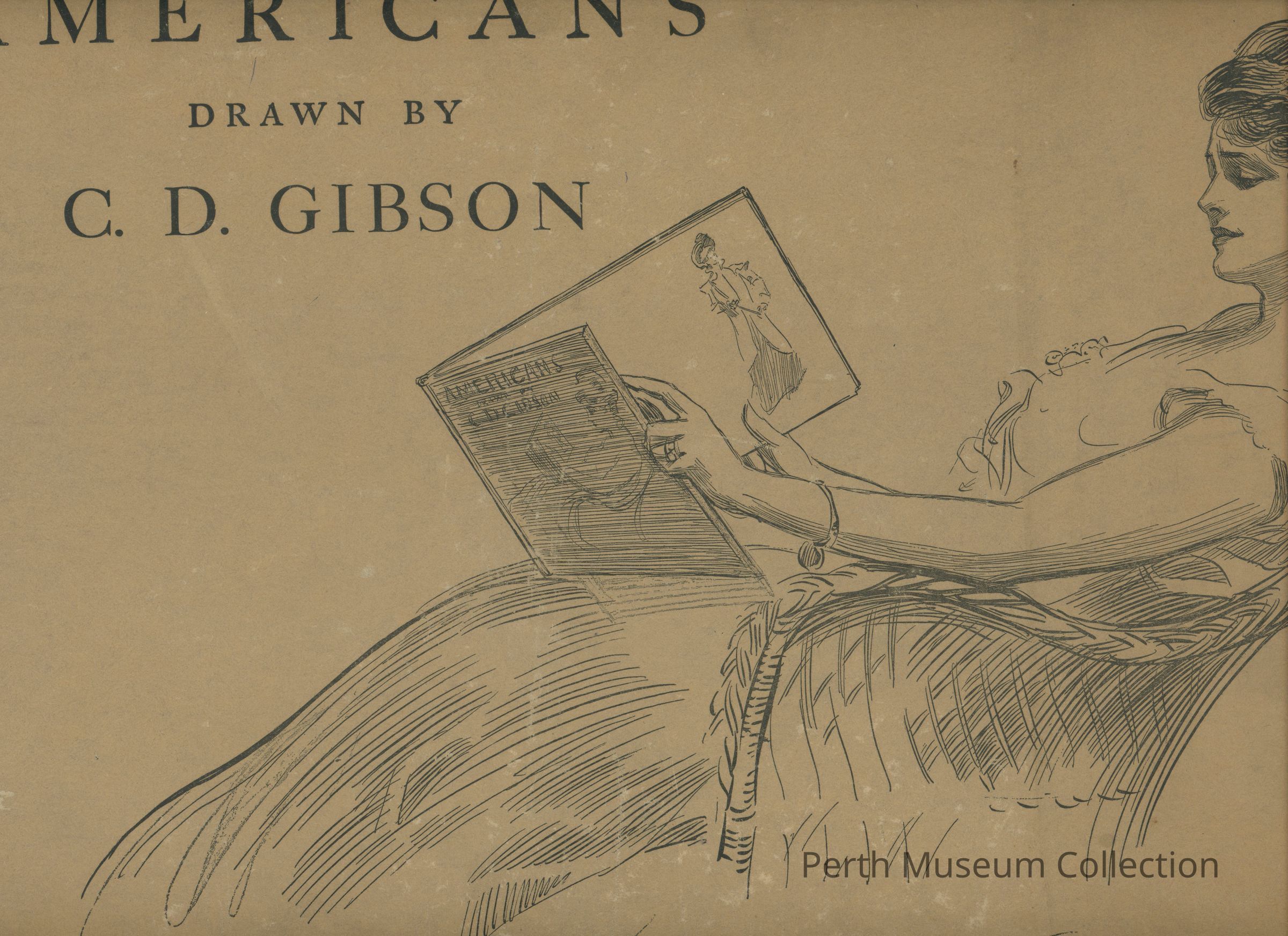 0003-Book-Hardcover- Approximately 84 pages- On the cover there is a women in a vintage dress sitting in a chair, reading a magazine. The book is beige with a white strip to the left and right of spine.Dimensions