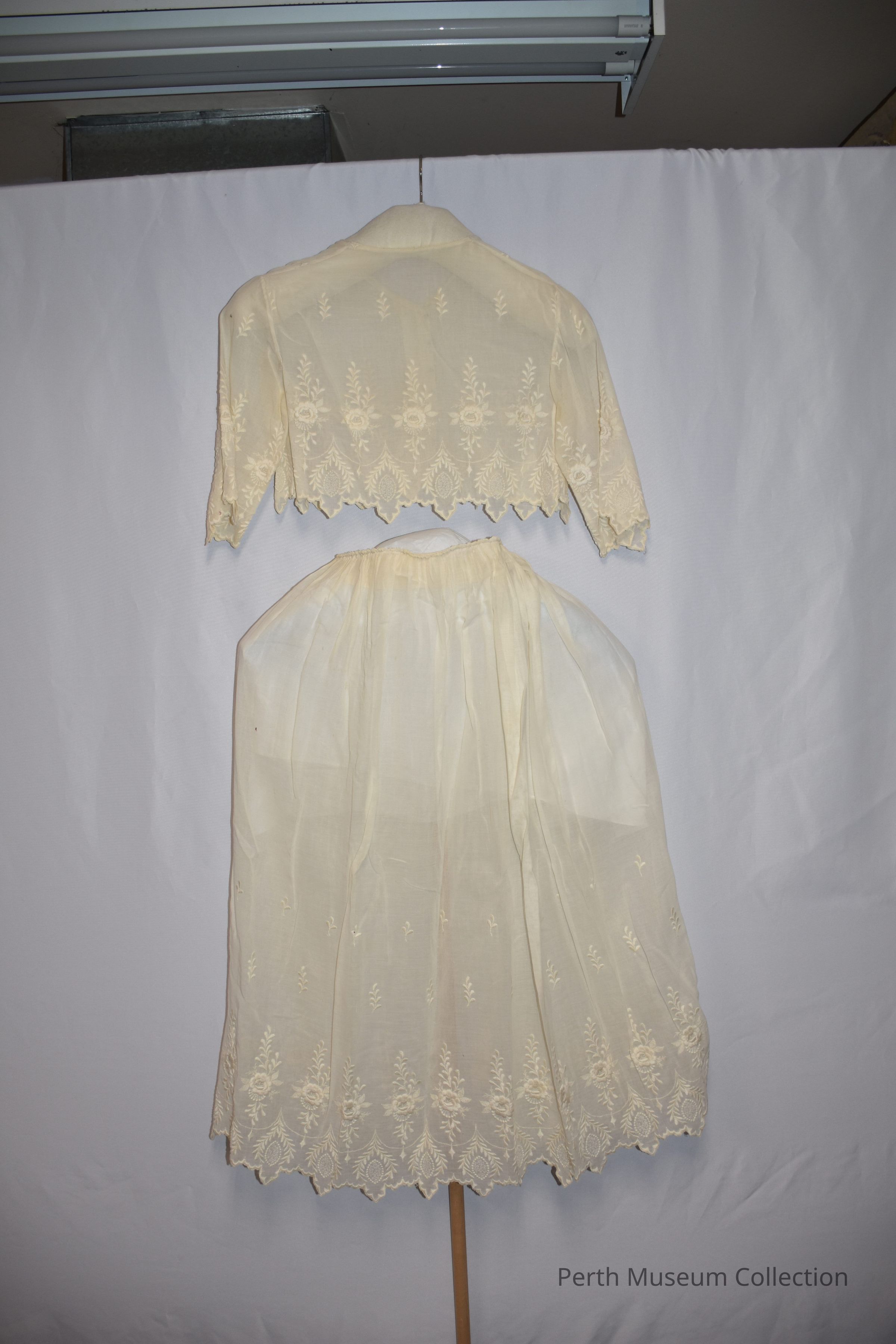 Costume (skirt and blouse) belonged to donor's aunt Ethel May Maclaren (1892-1968). Probably worn about 1910. Lived in Collingwood area. Ever fine lawn cotton with extensive embroidering on sleeves and bottom edge to a depth of 21cm.