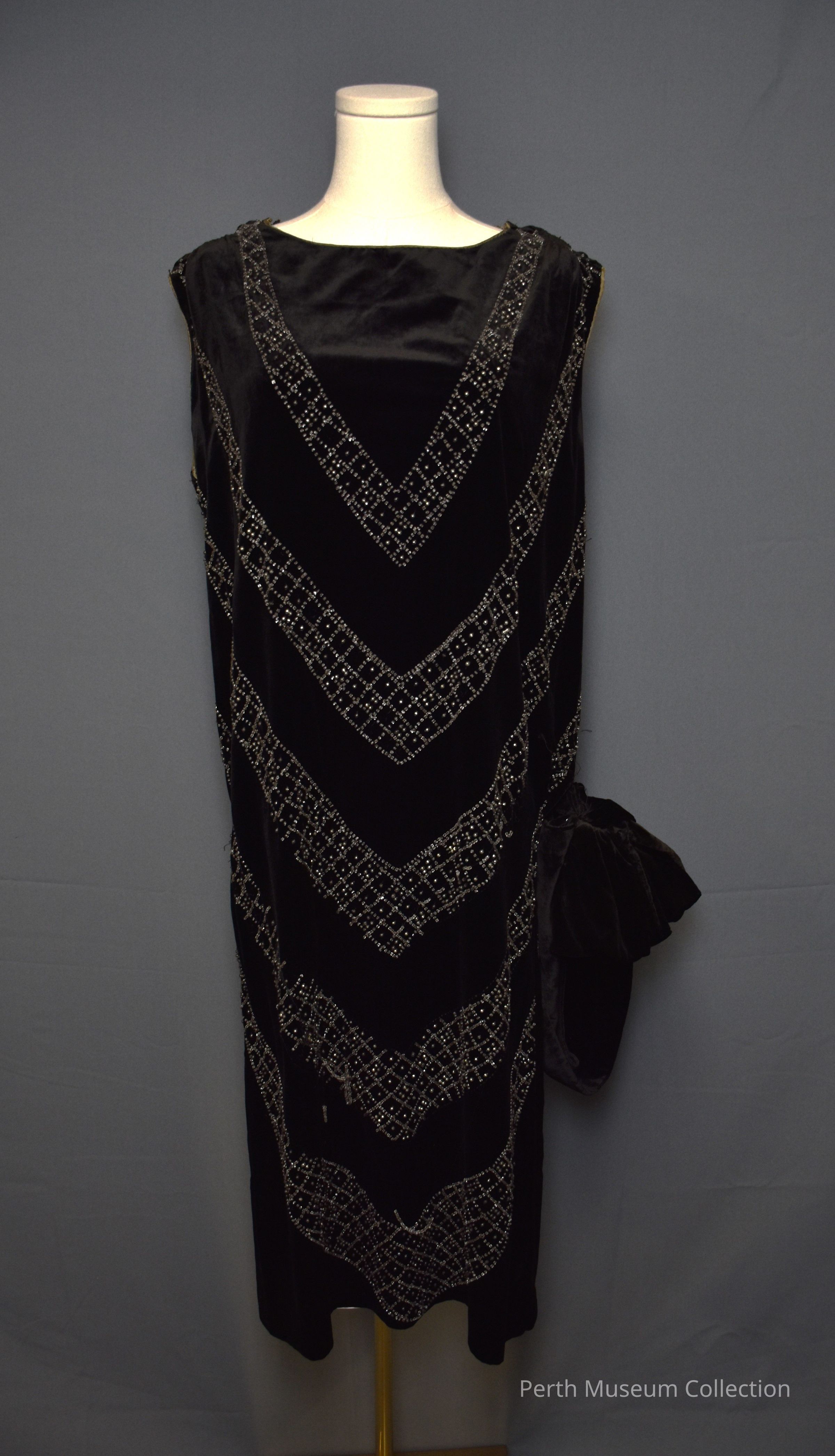 Chemise dress of black velvet is sleeveless with a high, wide neckline. It is beaded front and back with diagonal rows of crystal beads, starting from the shoulders and ending at the bottom of the skirt. The rows of beads meet in the centre to form a pattern of V shaped rows. There is a large black velvet bow with a long streamer at the left side of the hipline. The dress closes at the shoulder seams with hooks and eyes.