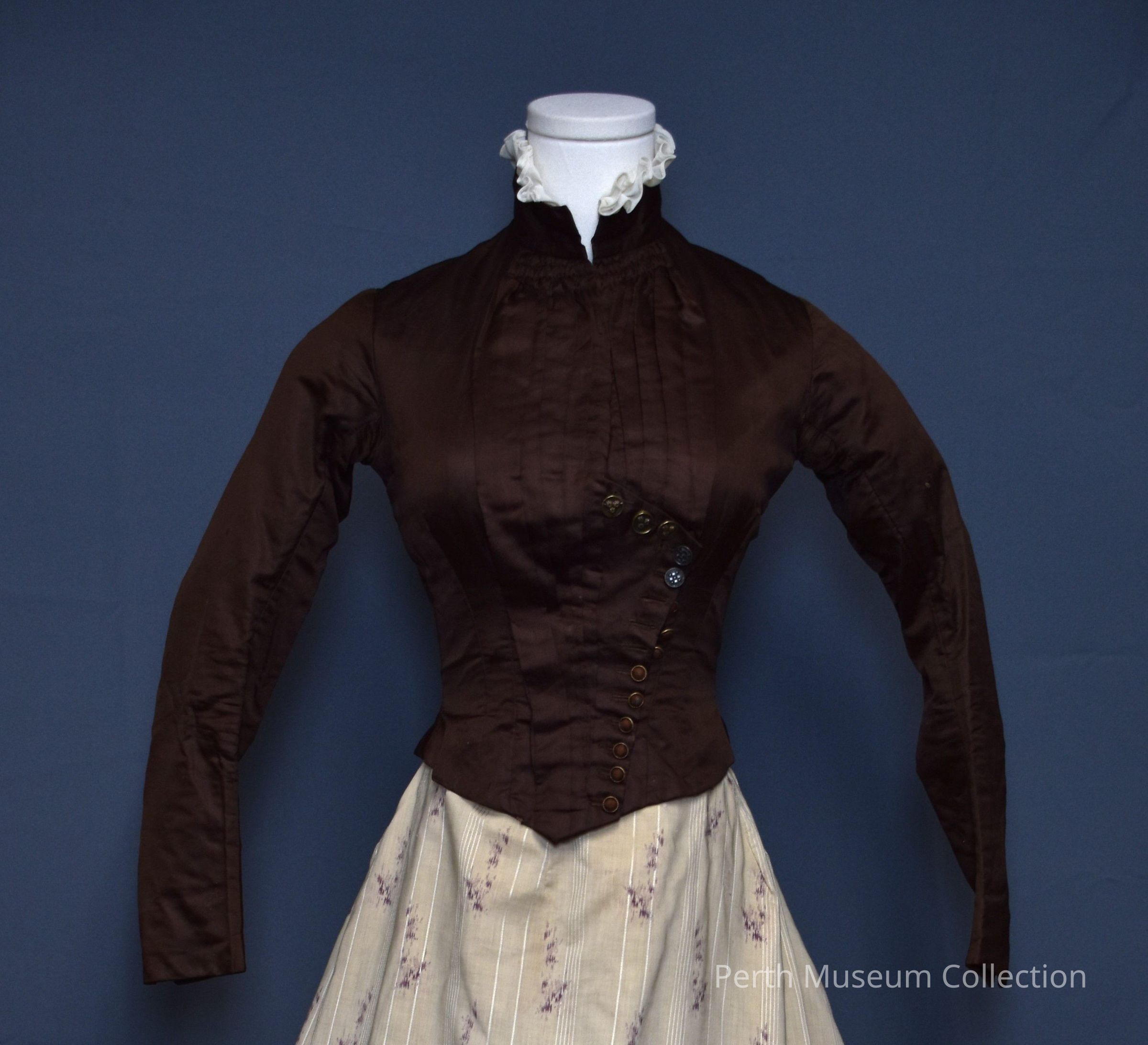 Wedding gown bodice (according to donour) of brown satin has long sleeves, ticked and slightly smocked front, a white chiffron ruffled around the high neck, hooks and eyes closure from neck to mid chest and then diagonally placed buttons. Handmade and elaborately lined.