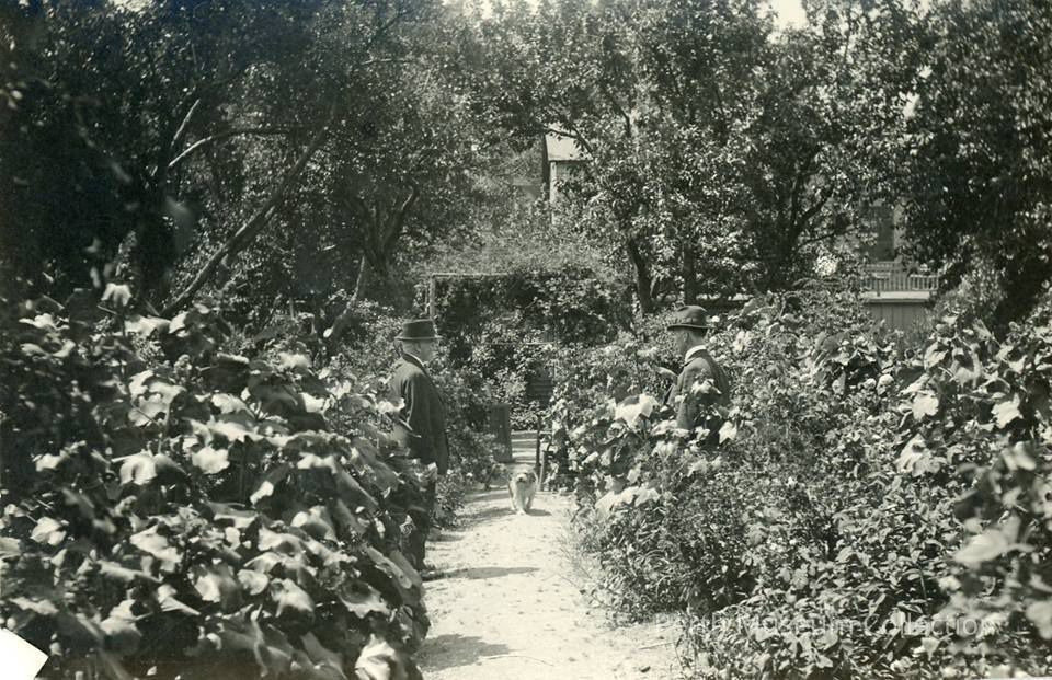 This view of the Matheson House garden, at the back of the house, is looking from the back of Shaw's towards the Perth Tea Room building, early 1900s. There are two men, maybe Arthur on the left and maybe Alan on the right.