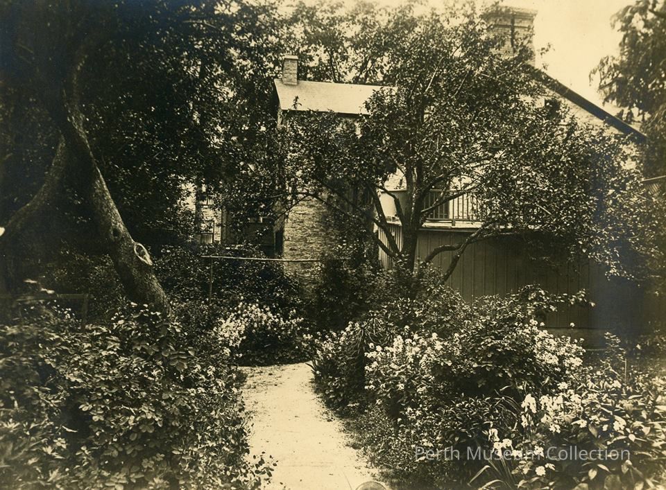 We will all soon be enjoying our summer gardens. This is the garden behind the Matheson House (The Perth Museum), early 1900s. You can just see a portion of a building that would have been the Perth Theatre across the street on Gore Street through the trees. Attached to the back of the Matheson House is small wooden building perhaps used the servants quarters or gardening shed.