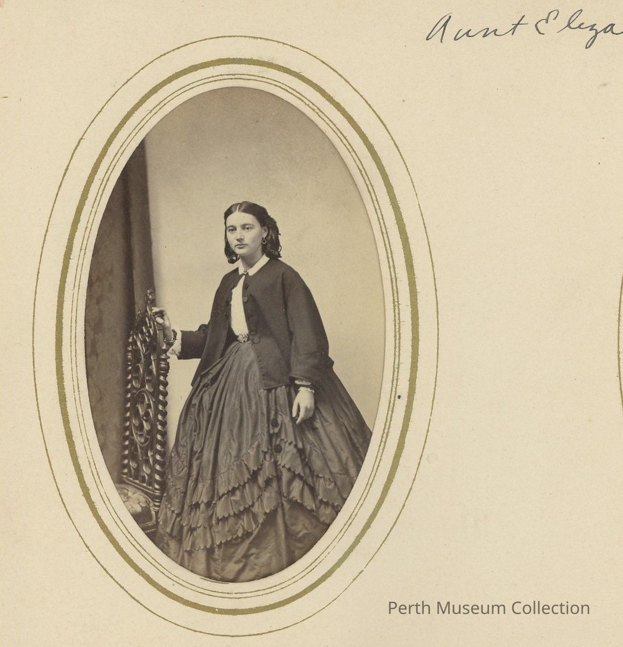 Photo depicts Eliza is standing with her arm resting on the back of a chair. She is holding a white piece of paper rolled up. She is wearing a dark jacket and dark skirt and looks like she is wearing a white blouse. At the top left side in red pencil it says May 1862 and in the middle in black ink it says Aunt Eliza.