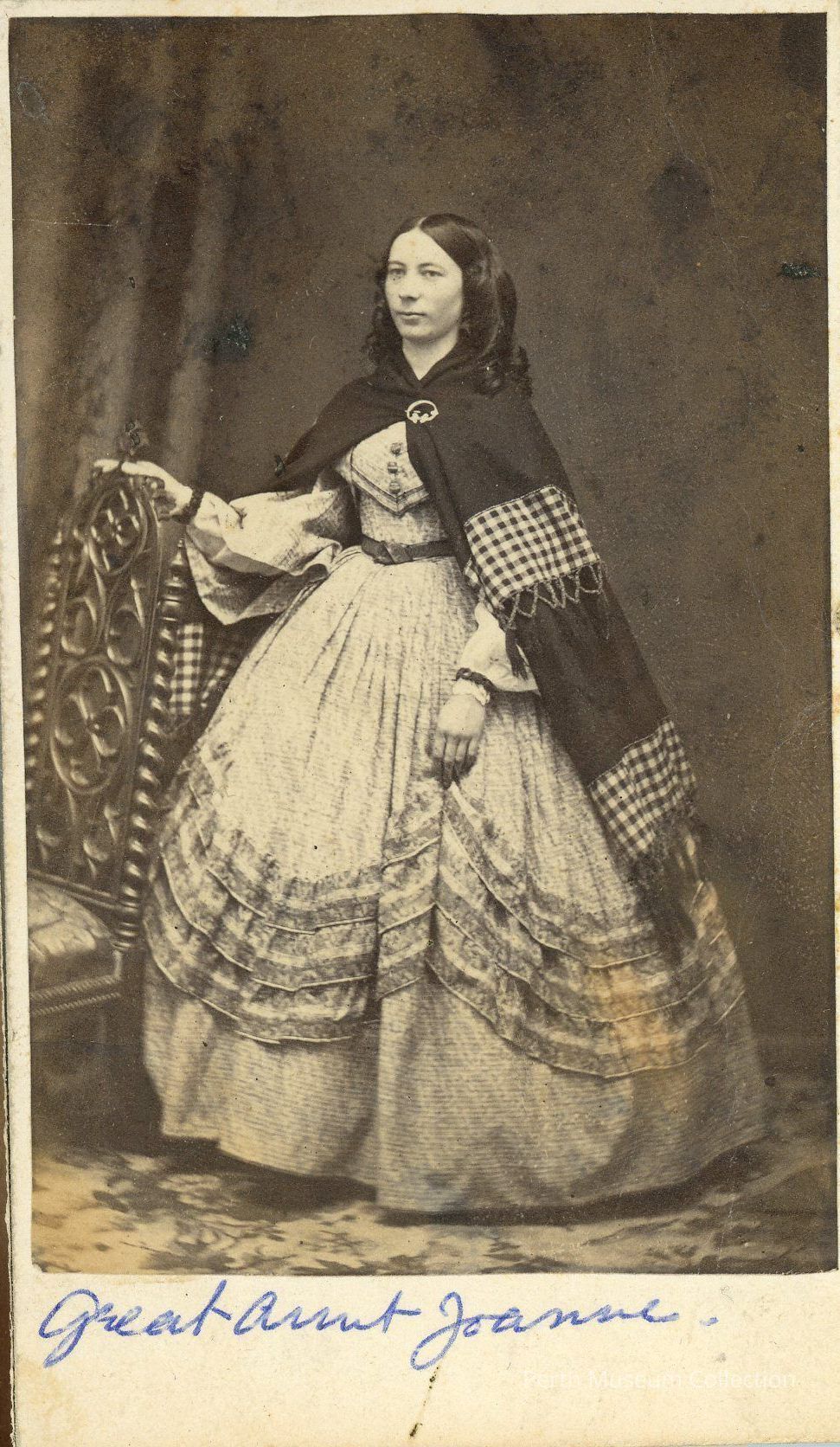 Photo depicts Joanna standing and looking right. She is wearing a light dress with a dark shawl. Her right hand is resting on the back of a chair. In blue ink at the bottom of photo says Great Aunt Joanne.