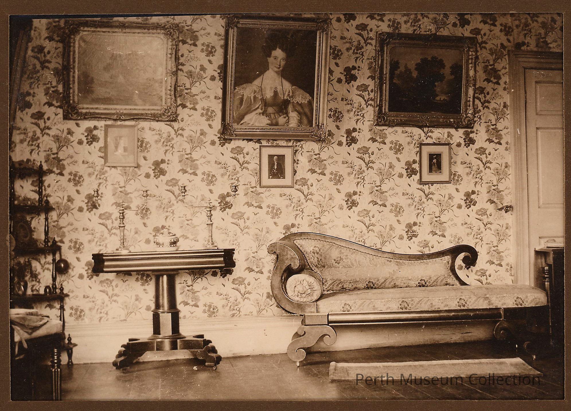 The image depicts a vintage room with floral wallpaper, adorned with framed artwork, including a large portrait and landscape paintings. A chaise longue with ornate wooden details and a patterned fabric aligns with the right wall, while a polished wooden console table with decorative candlesticks stands to its left. To the side, a corner shelf holds various objects, adding to the room's antique ambiance. The hardwood floor shines beneath a small rug, and a partially visible doorway suggests the room's historical charm.