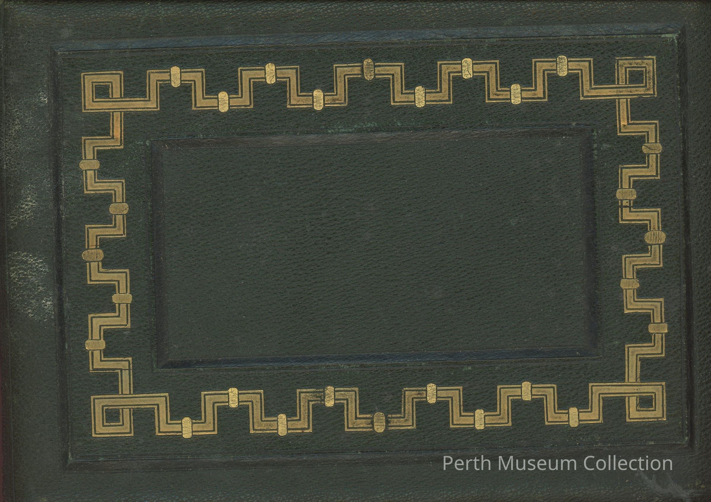 019.2.12.1 - Photograph Album - Dark green with a Greek design - 51 pages - 1st page reads: "Norah Madeline Shaw / Dec. 15 1929 / Perth Ontario. Some of the pages have photographs. All photographs are black and white. At the bottom of each page is the word 'PATENT'. There are pockets for 100 photo's.