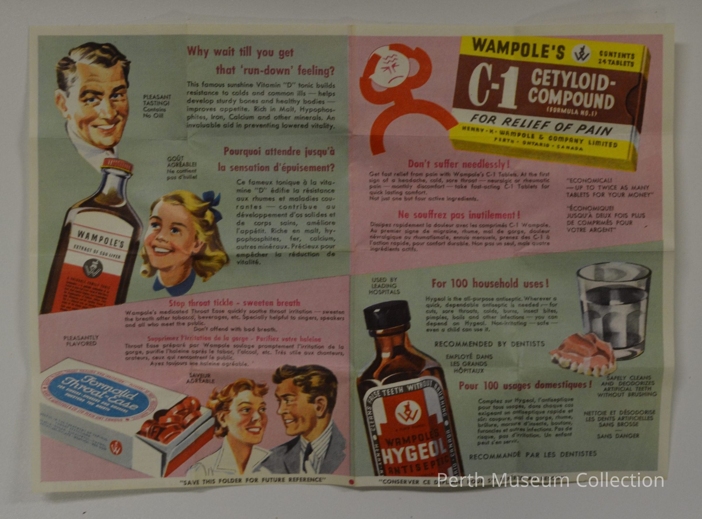 993.43.89c - advertisement, 11x16cm, 4 pages on 1 sheet, printed in multi-colour, Advertising 11 different Wampole products in both French and English. Folded into 8 sections.