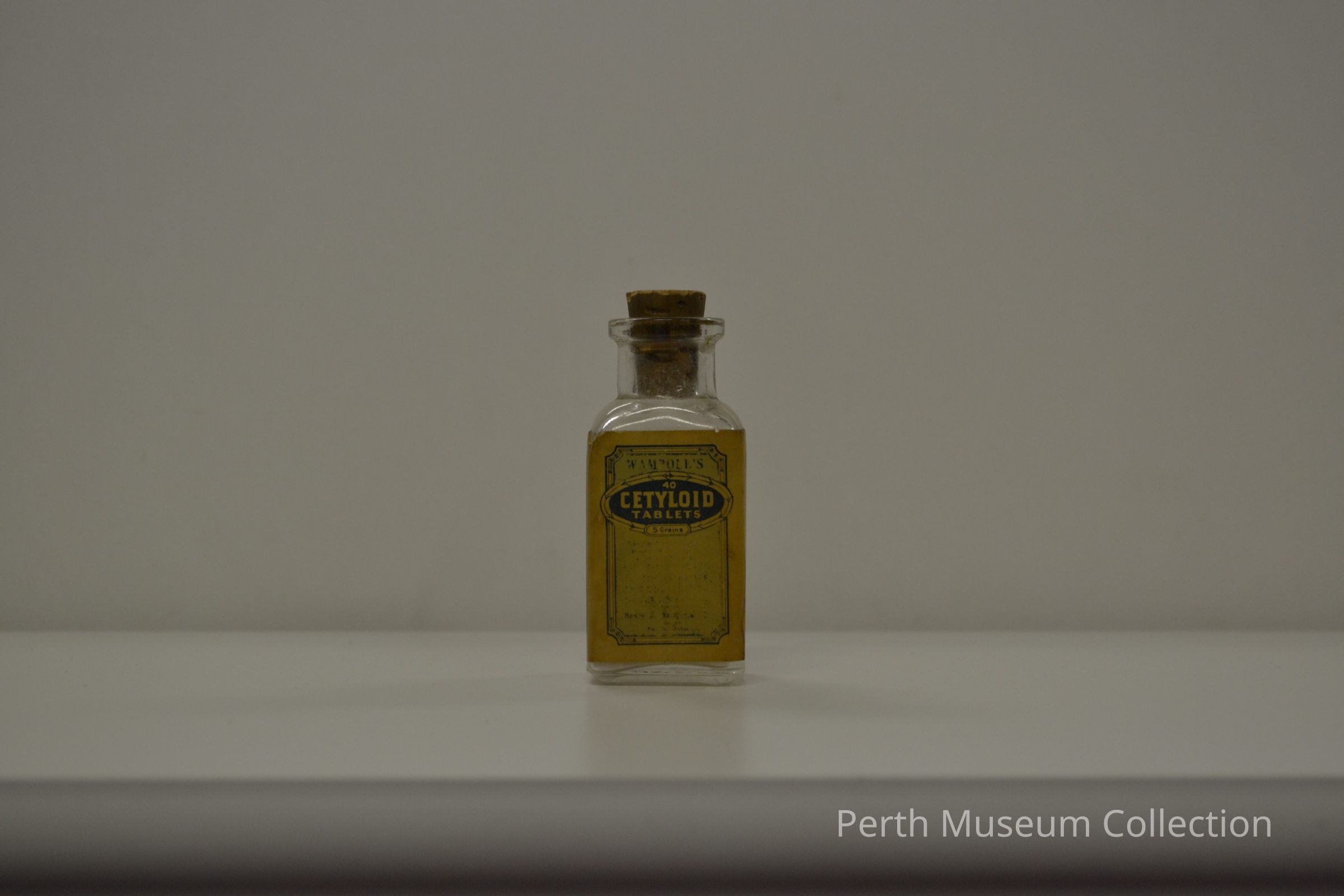 Rectangular clear glass bottle with cork stopper. The bottle contains 5 or 6 light pink tablets. A wrap around label is glued to 3 faces of the bottle, brinted in blue and light green. Most of the lettering one the label has been worn off, but "WAMPOLES/40/CETYLOID/TABLETS/5 GRAINS is still visible on the front panel/