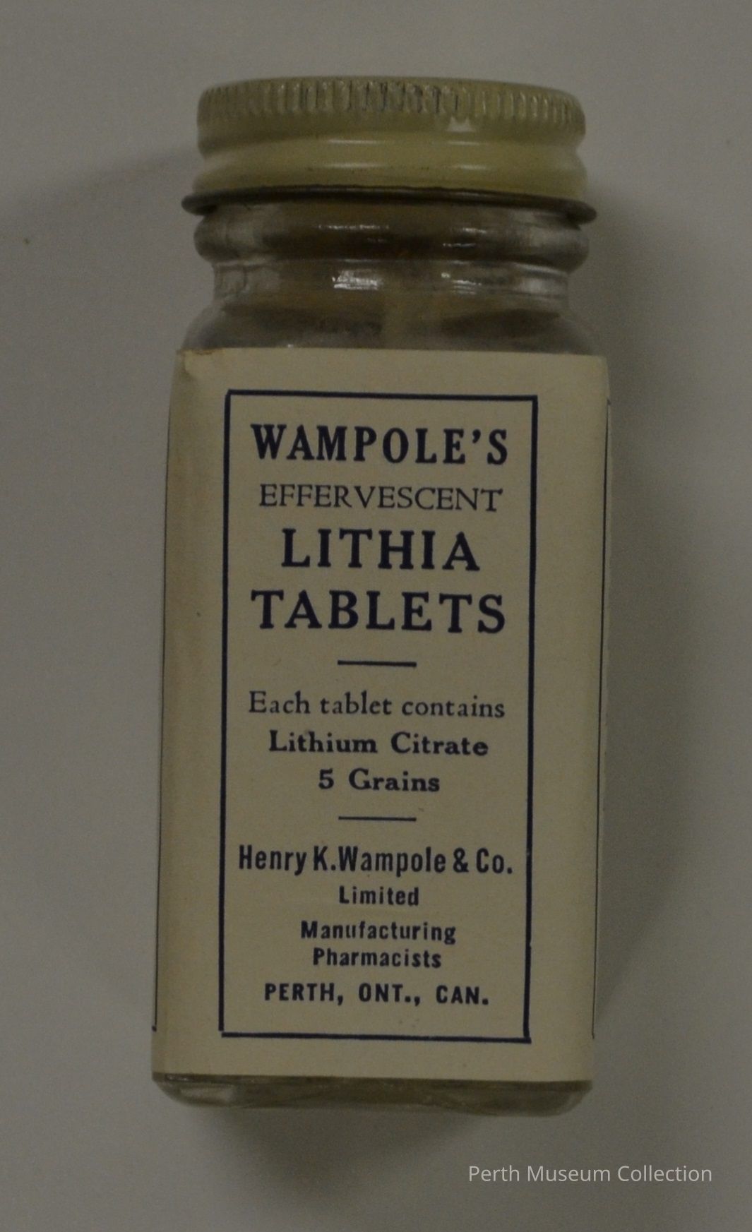 Bottle, Medecine - Square, clear glass bottle, 3.7cm square x 8.8cm high, with a cream coloured metal screw cap. Bottle has a cream coloured paper label, 9.5cm wide x 6cm high glued to 3 sides of the bottle. Text is printed in dark blue. Center panel text: