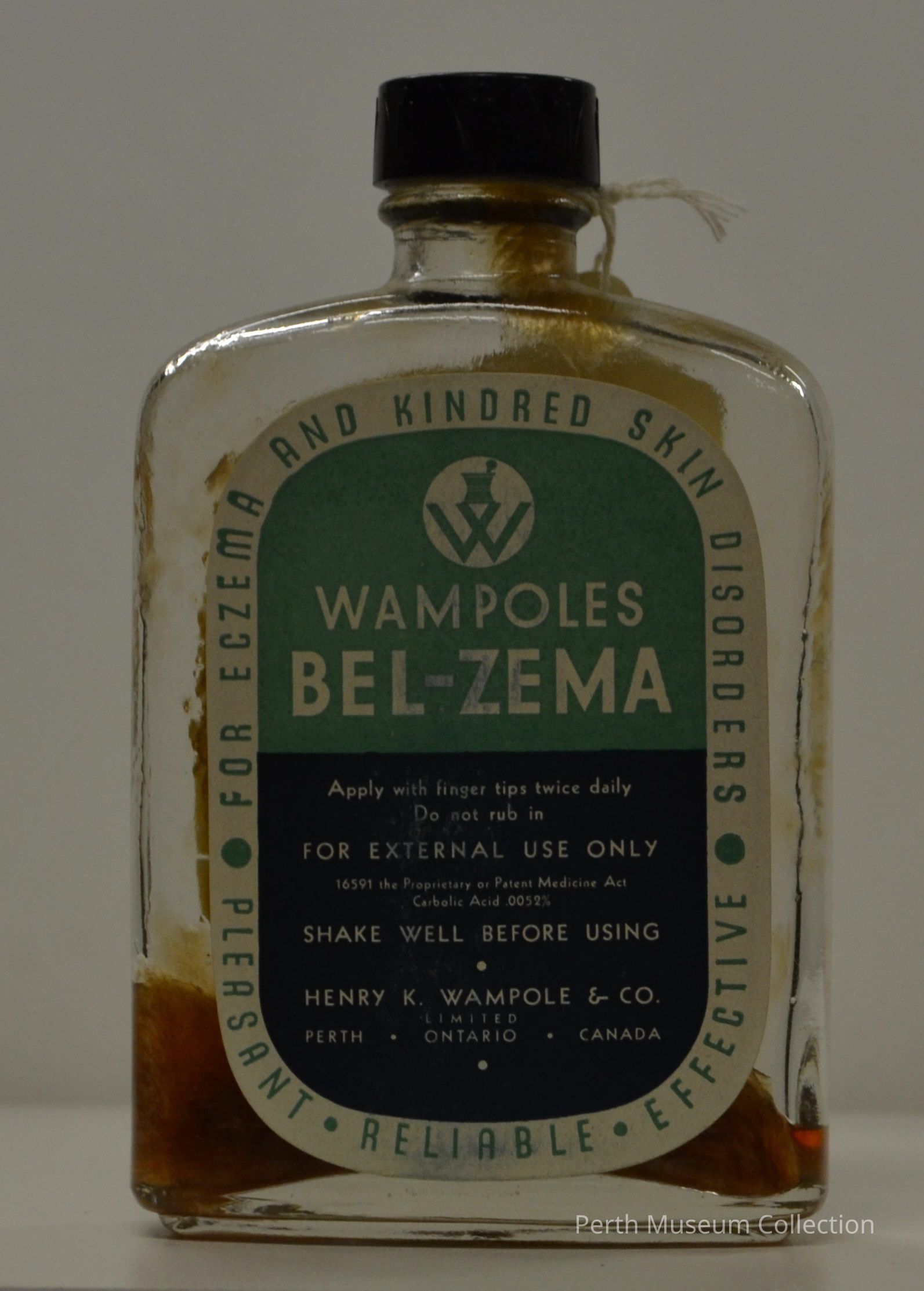 993.43.128a - Rectangular clear glass bottle, 8.5 x 3.2x 13.7cm high with a black plastic screw cap. There are 2 paper labels, rectangular with rounded corners, 6.7x9.5cm high, one English text the other French each glued to opposing faces of the bottle. The labels are white, printed in light green and very dark green ink. Raised letters on bottom of the bottle are: C (inside a triangle) 2296. The bottle contains remnants of the product on the filling about 5% of the bottle.