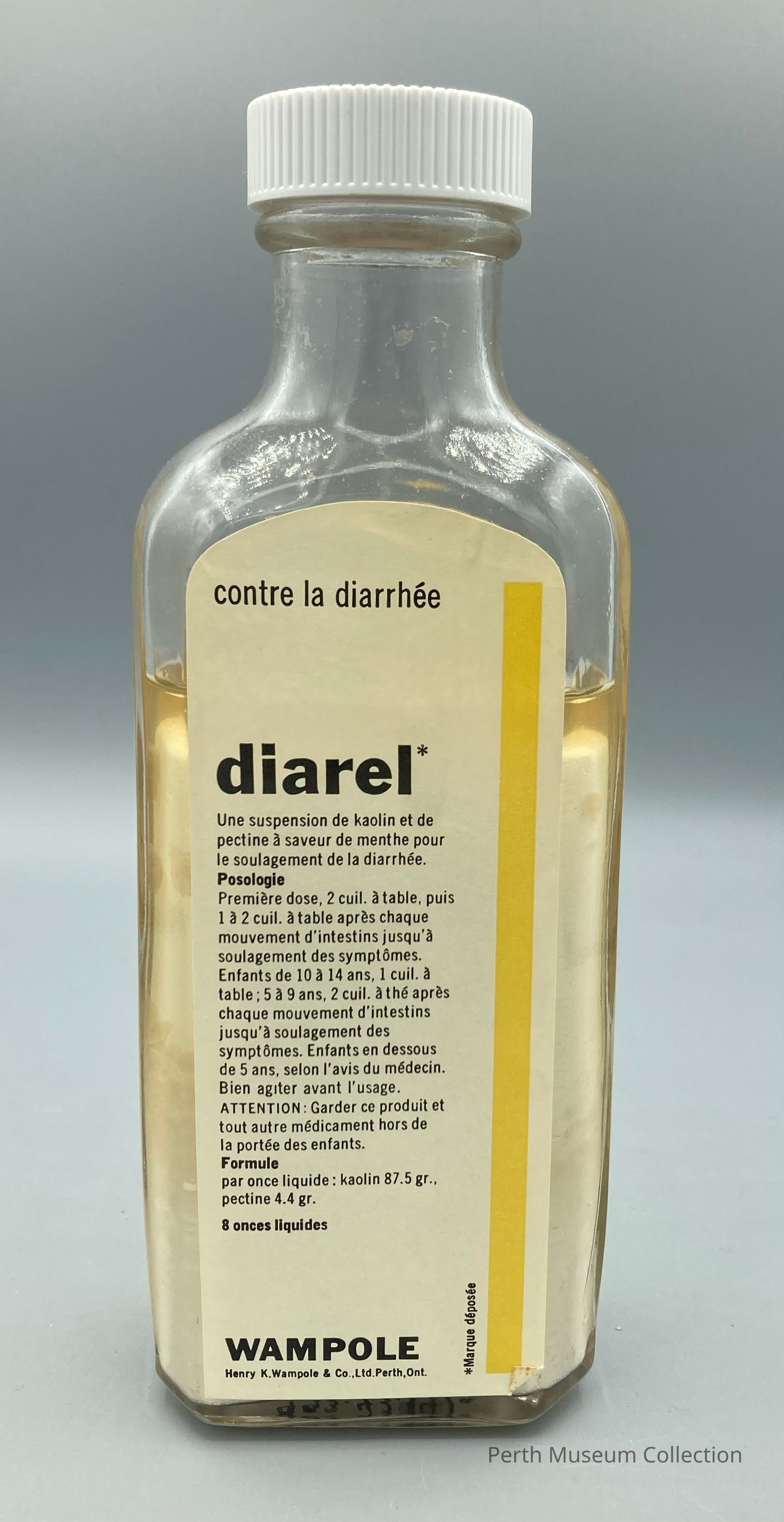 993.43.147a- Rectangular clear glass bottle, 3.8 x 6.2 x 17.5 cm high, with white plastic screw cap. Front and back of bottle each has a cream-coloured paper label 4.6 x 12 cm printed in black and yellow ink. For diarrhea, diarel* etc. One label in English, the other French. At the top of the English label is stamped in black ink: "(L) 2946Z". On the bottom of the bottle in very faint raised letters is: 2244. The capacity of the bottle is 8fl oz (237ml). The bottle is nearly full and the kaolin and pectin ingredients are suspended in liquid and the bottle is 7/8 full.