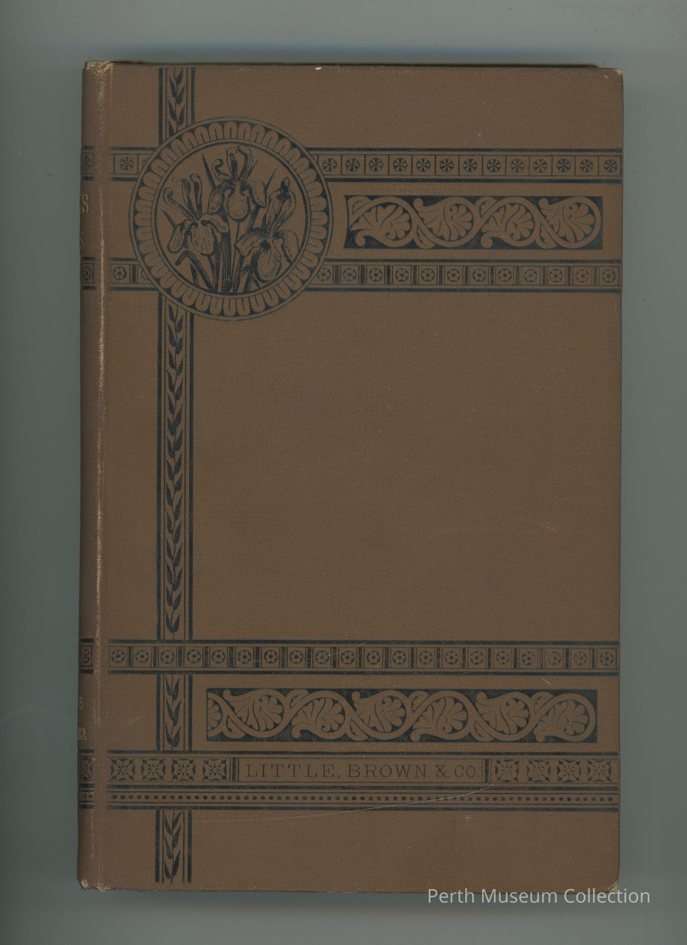0077 - Hardcover - 463 Pages - The cover is brown, there are designs that border the left and top side of the book. There are irises in a circle in the top left corner and there title and author are printed on the spine in gold.Dimensions