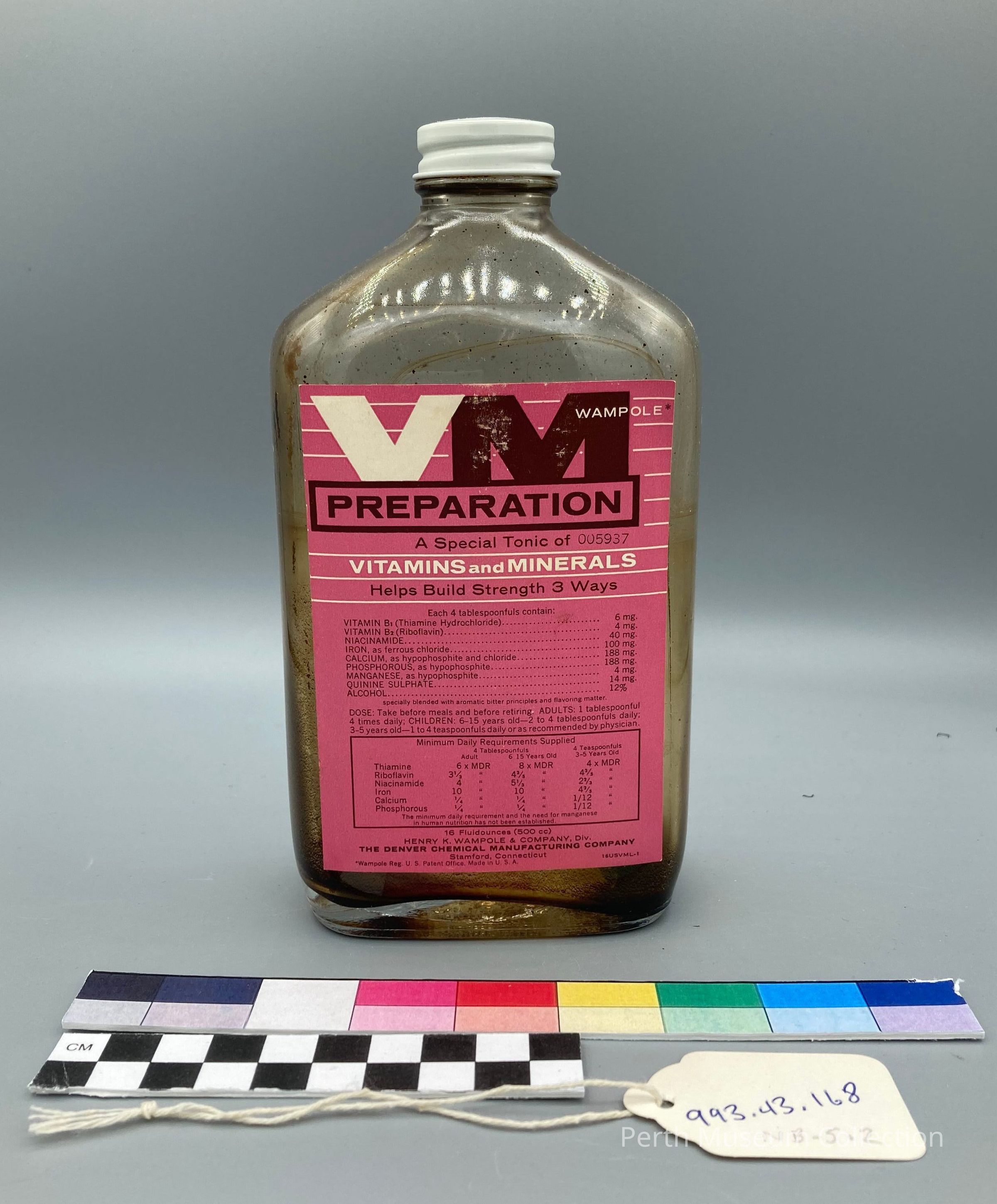 993.43.168b- Cardboard box, 9.5cm wide, x 5.5cm deep x 17.8 cm high. Cream-coloured cardboard printed in pink and black on all panels except the bottom. Text similar to bottom label. The lettering on the front of the box describes the purpose of VM PREPARATION as "a triple action tonic..." Underneath the words printed in black and white ink "IRON DEFICINCY ANEMIA is the hand-written number "179" in black ink with an upward strike below the 7 and 9.