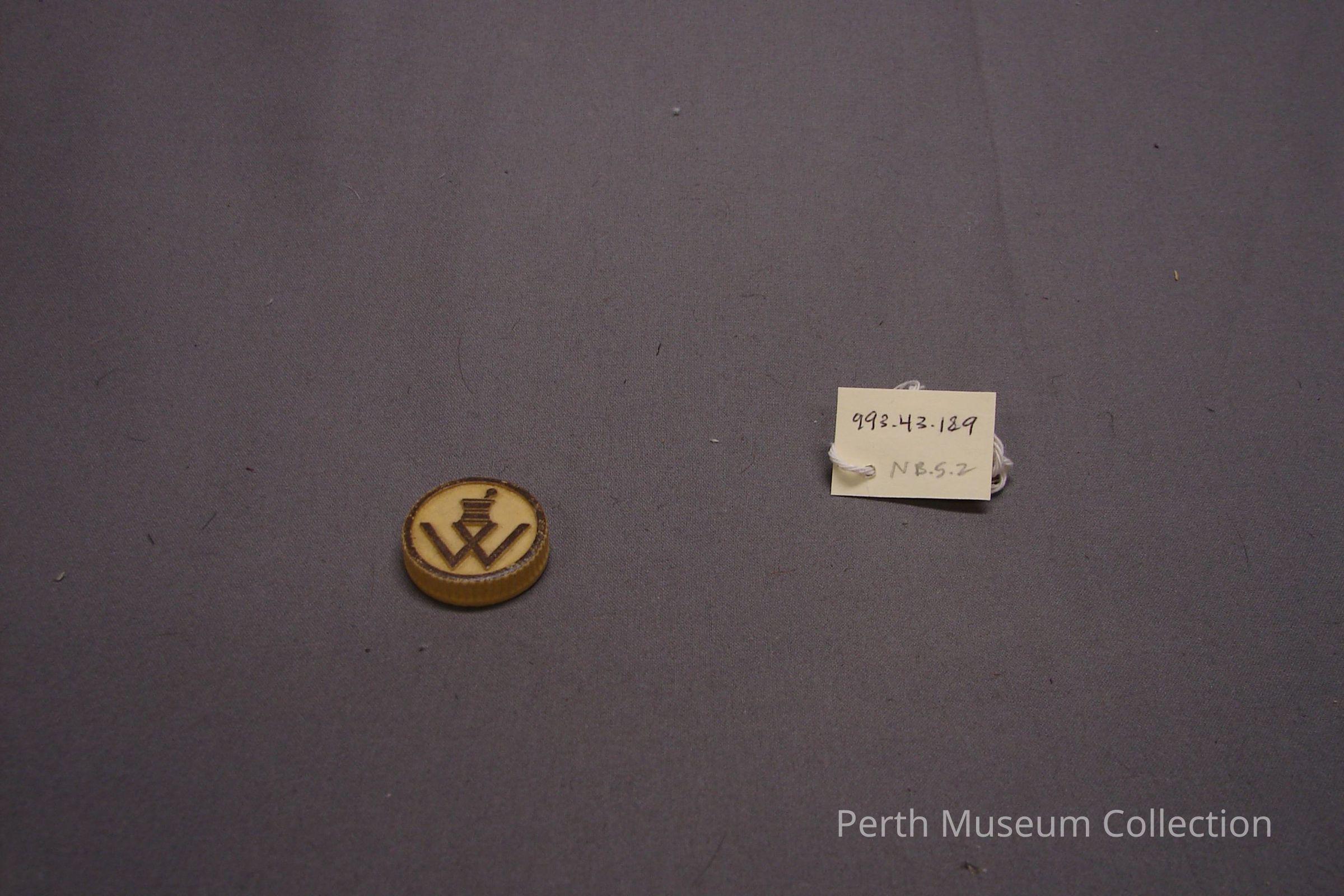 Circular, yellow plastic bottle stopper top. The top surface consists of a large Wampole "W" logo in brown plastic, raised from the yellow plastic surface. The bottom of the artifact shows fragments of cork where it was broken off the cork bottle stopper.Dimensions