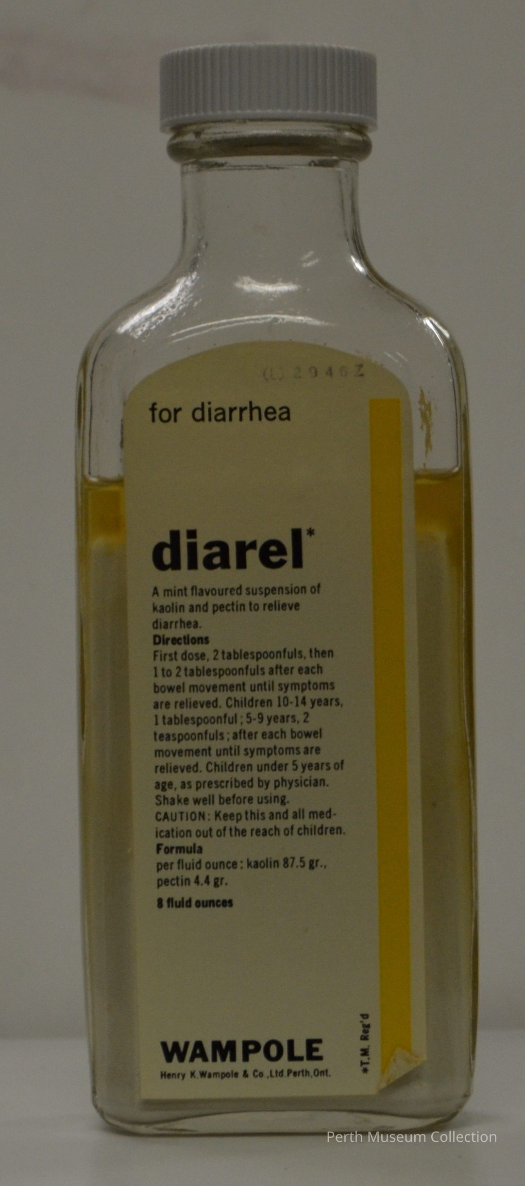 993.43.147a- Rectangular clear glass bottle, 3.8 x 6.2 x 17.5 cm high, with white plastic screw cap. Front and back of bottle each has a cream-coloured paper label 4.6 x 12 cm printed in black and yellow ink. For diarrhea, diarel* etc. One label in English, the other French. At the top of the English label is stamped in black ink: "(L) 2946Z". On the bottom of the bottle in very faint raised letters is: 2244. The capacity of the bottle is 8fl oz (237ml). The bottle is nearly full and the kaolin and pectin ingredients are suspended in liquid and the bottle is 7/8 full.