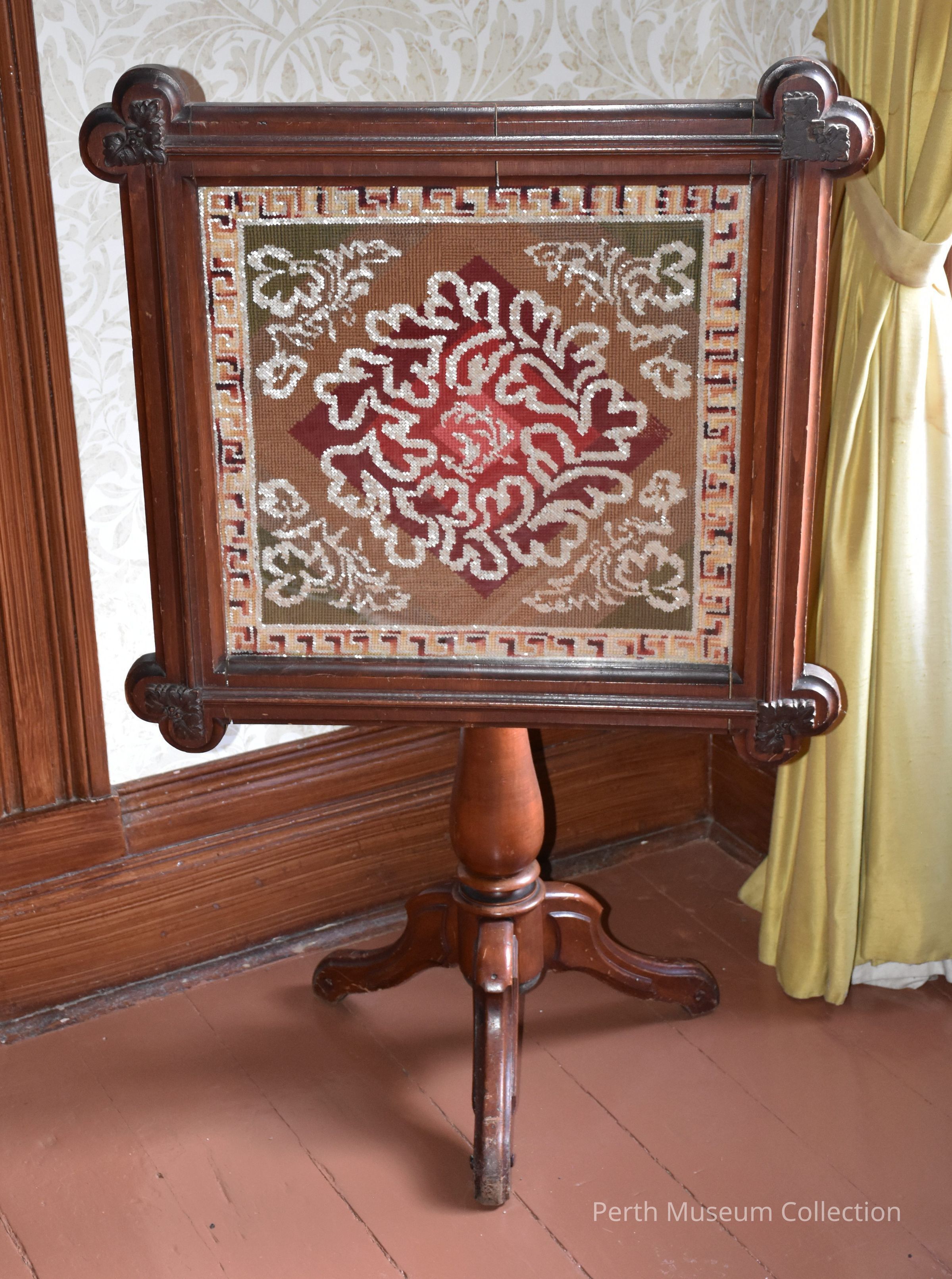 Tilt top table/fire screen, turned walnut pedestal base with three legs and walnut frame. Carved leaves appear in the corners of the frame as in picture frames of the period. Needlework is protected by glass. Gros point background in green, design in white crystal beads. There is a dark crimson background with three lighter shades in diamond patterns to form the centre. It has a border in orange, brown, and yellow with beading in a Greek Key design. The needle-work was done by Eliza Sache, daughter of Colonel C.H. Sache, a half pay officer who came to Perth in 1815. Charles Henry Sache, 1st Lieutenant of the 76th regiment of foot went on half pay on the 25th of Sept. 1817.