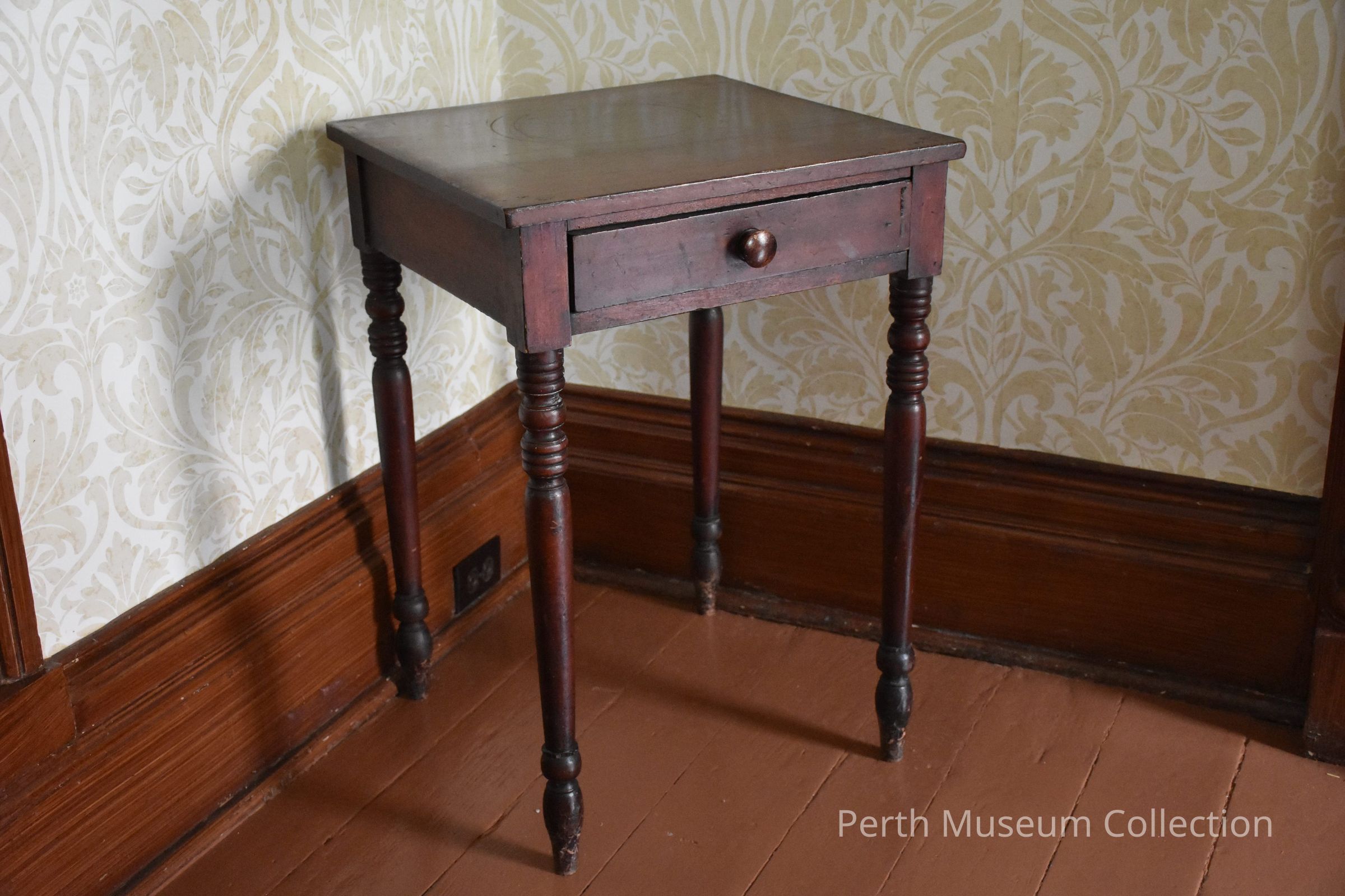 Small typical mid nineteenth century, usually of the kind used in bedrooms as side tables. Constructed of pine and walnut with reddish varnish very sloppily appled at one point. It has one pine drawer with a walnut knob. The legs are rather slender and turned. The top is protected with a sheet of clear glass. The top of the table is quite loose. The old nails are in evidence, even on the top of the table in one corner.