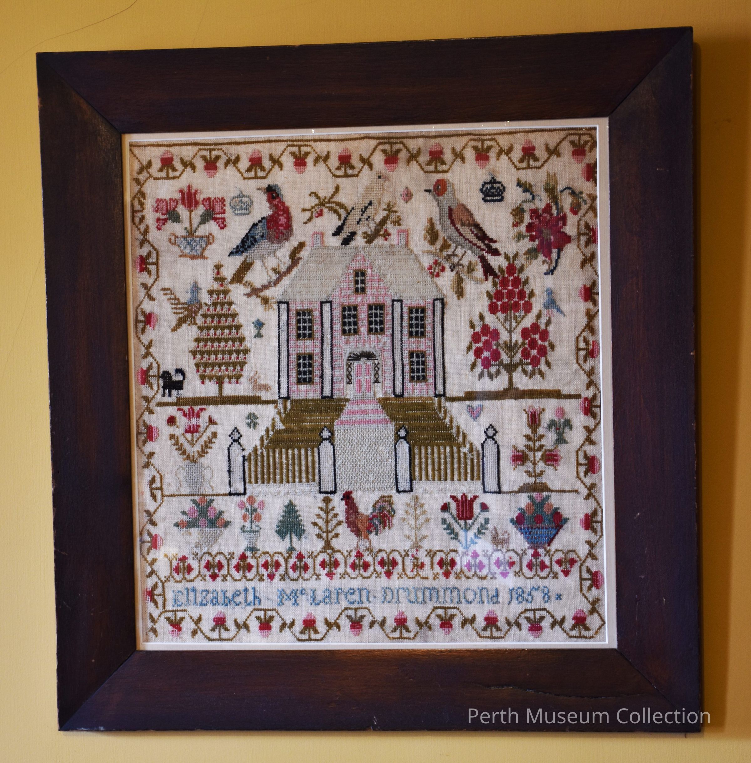 This fine example of an early sampler is in a wide walnut frame with the original glass and wooden backing with two brass hanging rings. It is worked in multi-coloured wools on an ecru linen ground. The design consists of a large elegant house with a fanlight door and pilasters, with a white picket fence in pink and white wool. This house is reminiscent of the Daniel McMartin house on Gore Street, but not exact. It is flanked by a pair of birds with a white bird sitting directly on the roof of the house. The rest of the design consists of flowers, trees, baskets of flowers and a rooster at the gateway to the house, the whole picture is surrounded by a sinuous border of stylized strawberry vines in natural colours. Across the bottom is the name of the embroiderer: "Elizabeth McLaren, - Drummond 1858". This sampler is believed to have hung ober the dining room mantlepiece of the Glossop House at the corner of Beckwith and Foster streets in Perth, the most charming stone house in the town. Elizabeth McLaren latter became Mrs. Glossop.Made/Created