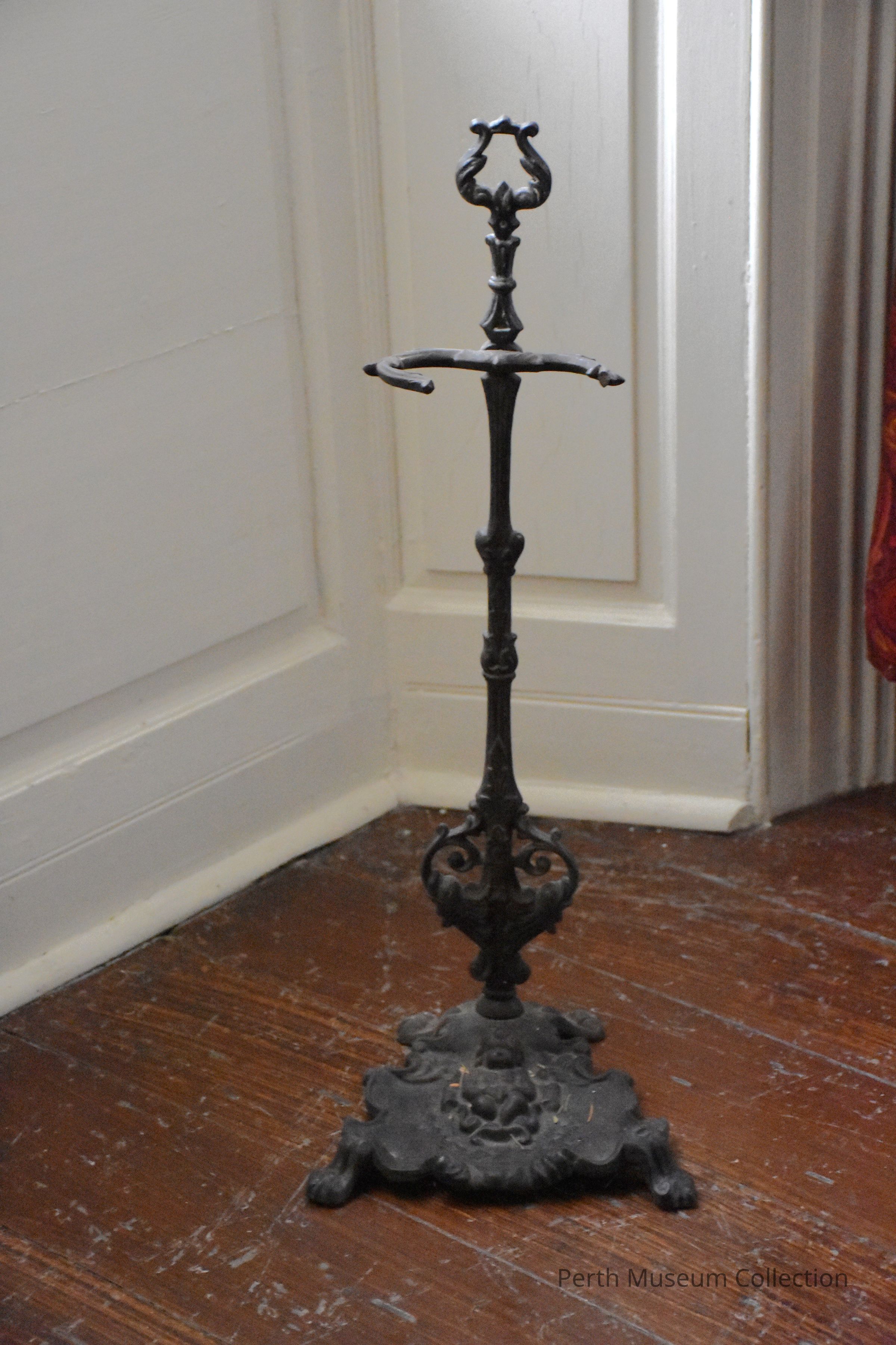 This is an elaborately cast iron three part fireplace stand. The base is loose from the support shaft and the left side of the "holder" arm is broken. It terminates at the top in a lyre shape. The elaborate footed base or "pan" has a three dimentional fat cherub moulded in it with a scrolled surround and scrolled surround and scrolled feet. This looks dirty due to rust a previous caoting of grey paint now almost completely worn off.