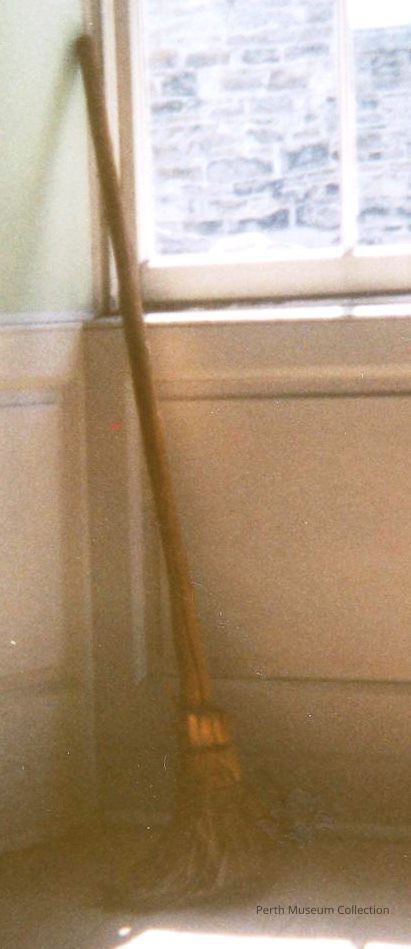 This very old pioneer broom has a wooden handle and a cornhusk bottom. This bottom is secured with rope. It was made and used by Robert Grinlay at his pioneer homestead, and the 5th concession of the Bathurst Township, Lanark County, Upper Canada. It dates from before the 1840's.