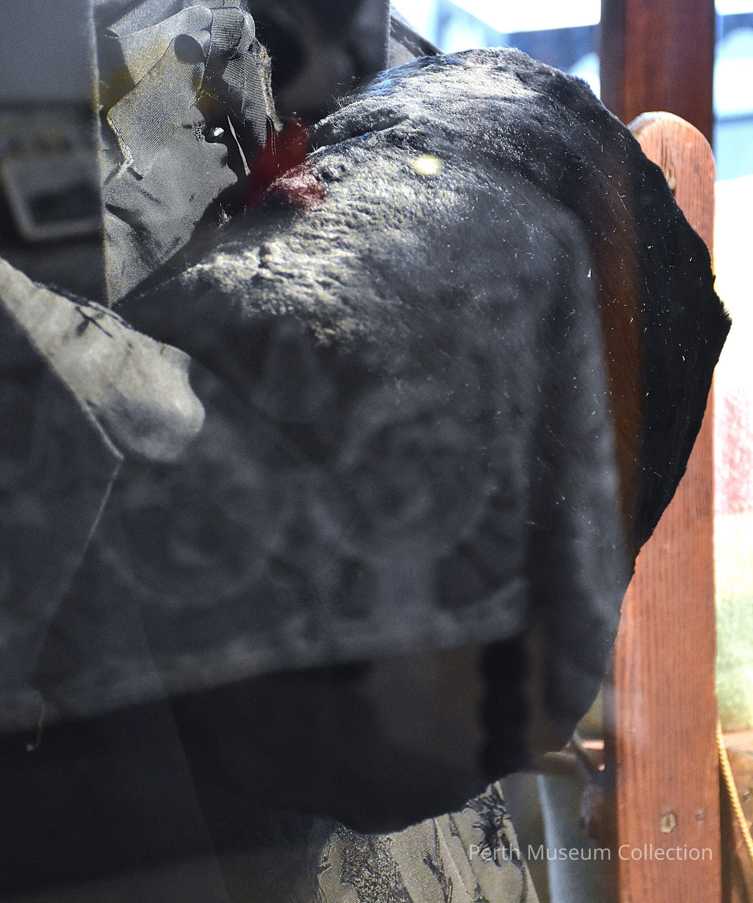 Cylindrical muff with outside of black fur possibly mink. Lining is comprised of coffee coloured material with an abstract floral pattern woven into it in a mink chocolate colour. On one end of muff opening is a braided cord ring attached to the muff by several loops of soutache and material the rins, soutache and material black.