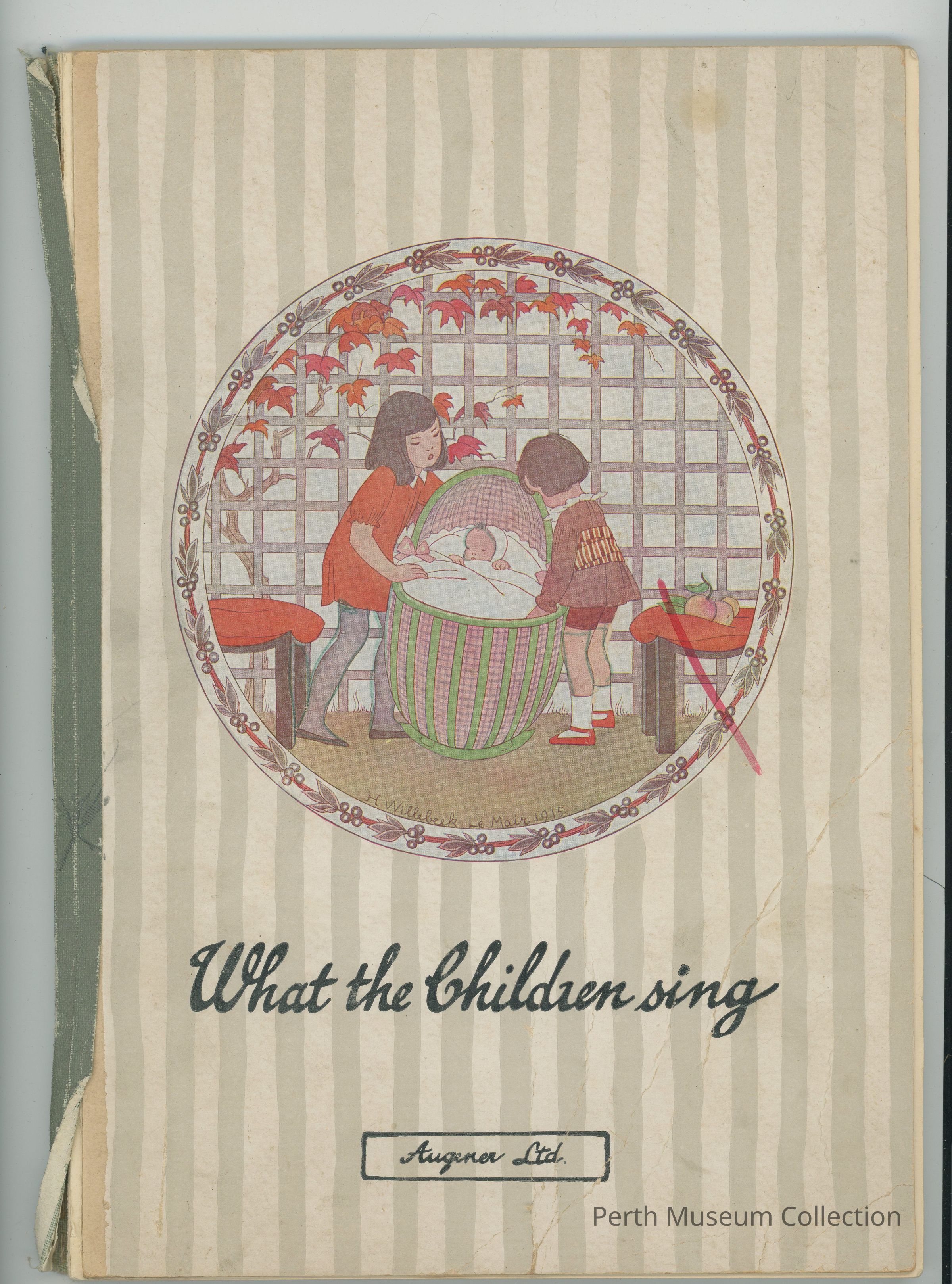 006.19.3-Songbook-Softcover-64 Pages- The cover of the book is white and grey strips with a picture of two children around a baby's basket on it. the spine of the book is green and it wraps onto the front of the book to the right and left.