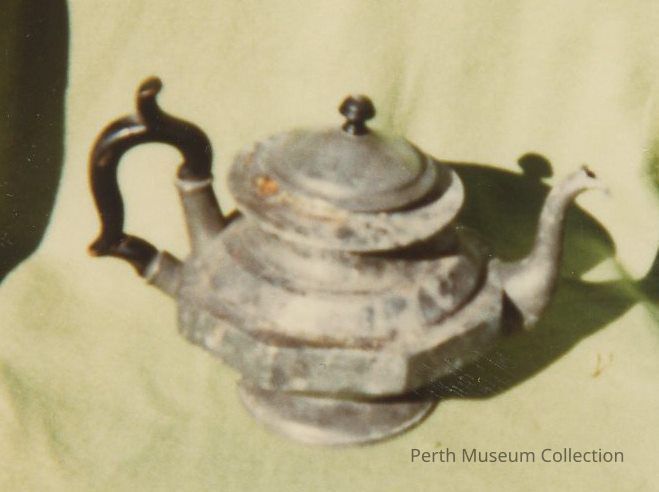 This pewter teapot is shaped like an octagon with eight sides. The base is missing a part of pewter. The spout of the teapot is very fluted and elaborate. The handle is made of wood and has been painted black. it is broken at the bottom. The finial (?) for the lid is also made of wood and has been painted black as well.