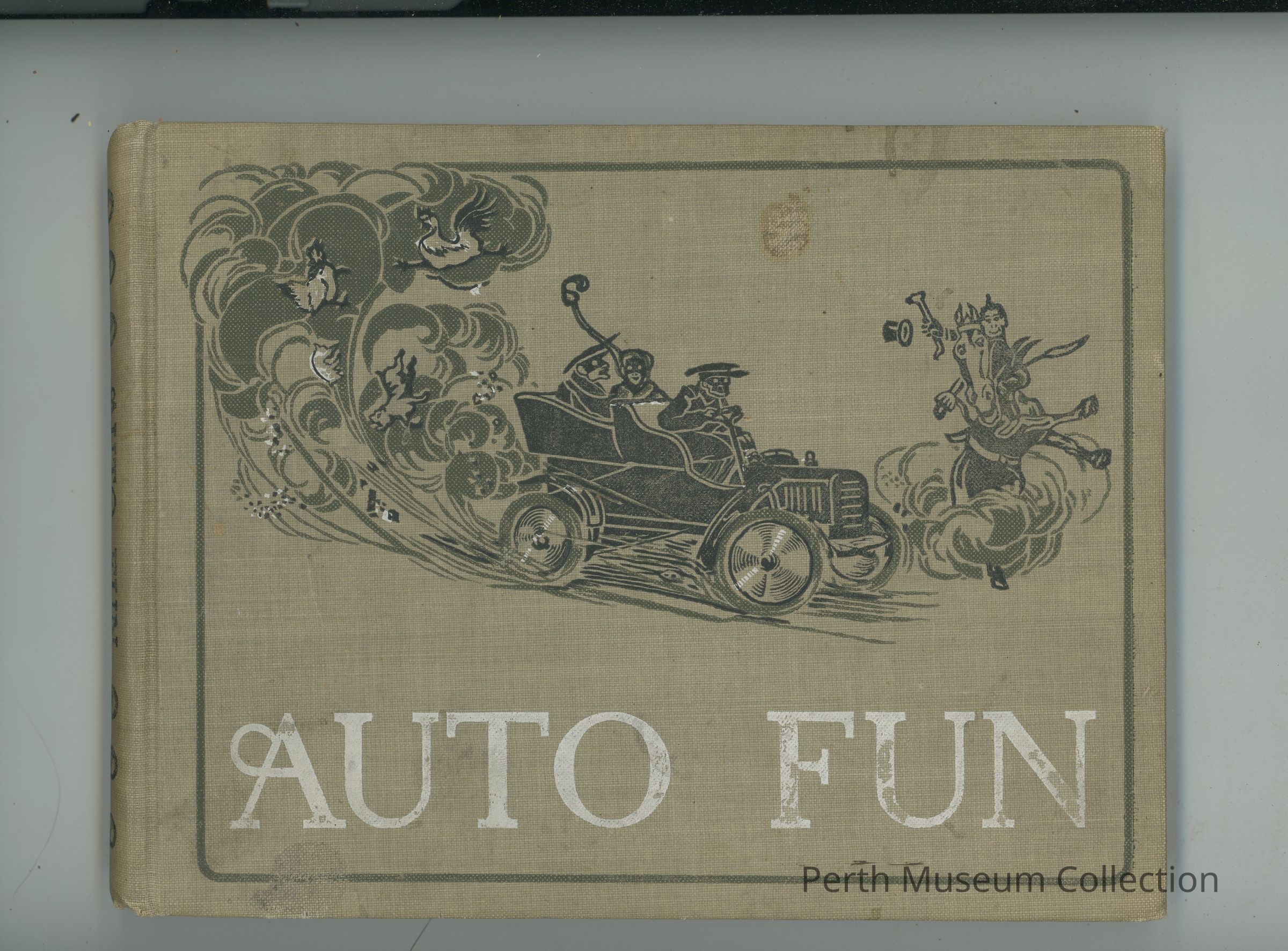 905.00.01- Hardcover- Unknown amount of pages- The book is beige and with white text printed on the front, there is people riding in a car with animals around it printed in the middle. There are stains and discoloration as well.Dimensions