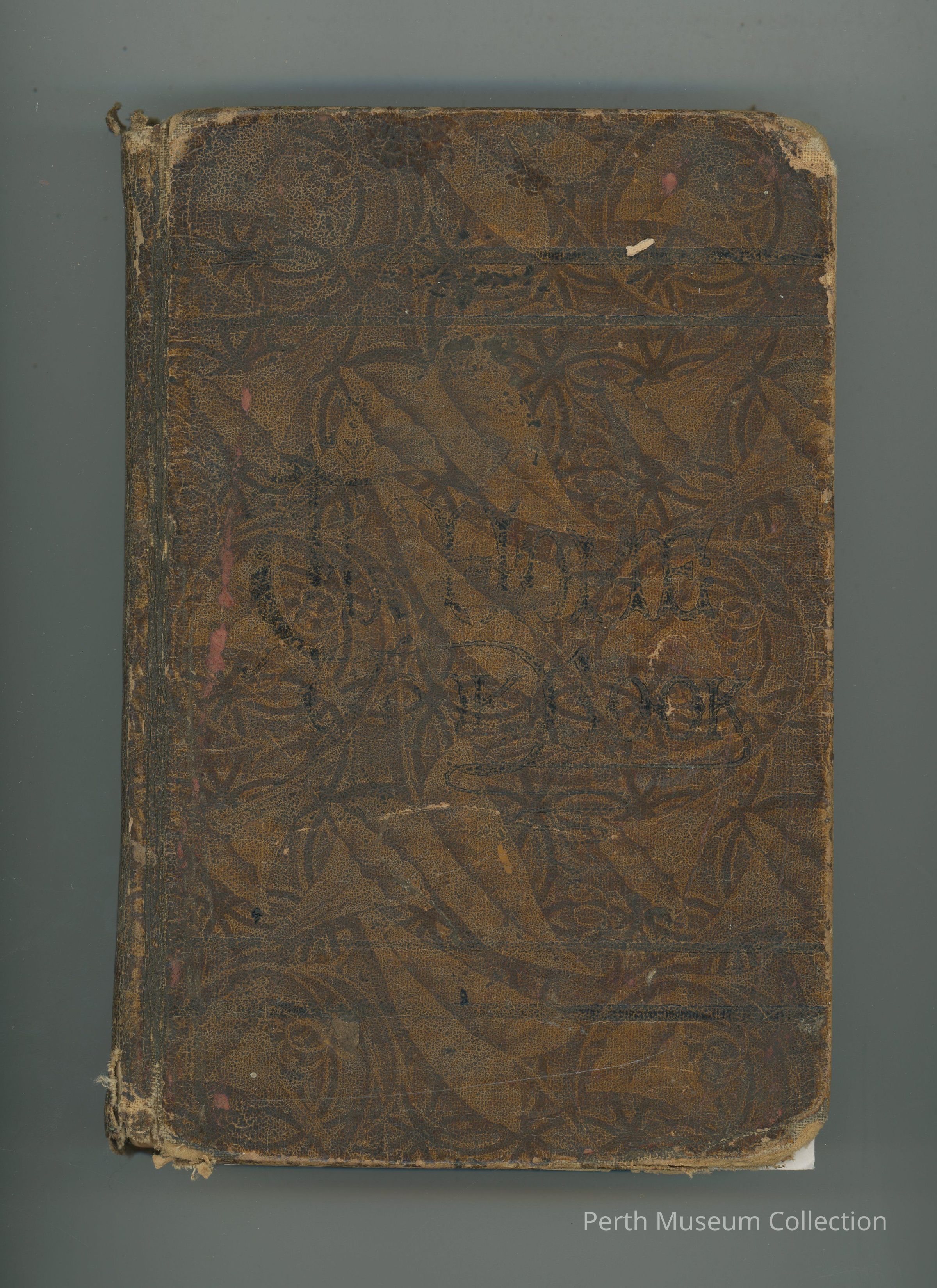 993.20.1 - Hardcover - 380 Pages - The cover is brown with designs of leaves printed on the entirety of it. Th title was printed on the front of the book but has faded off, on the top and bottom of the front cover there are two horizonal lines pressed in the book.Dimensions